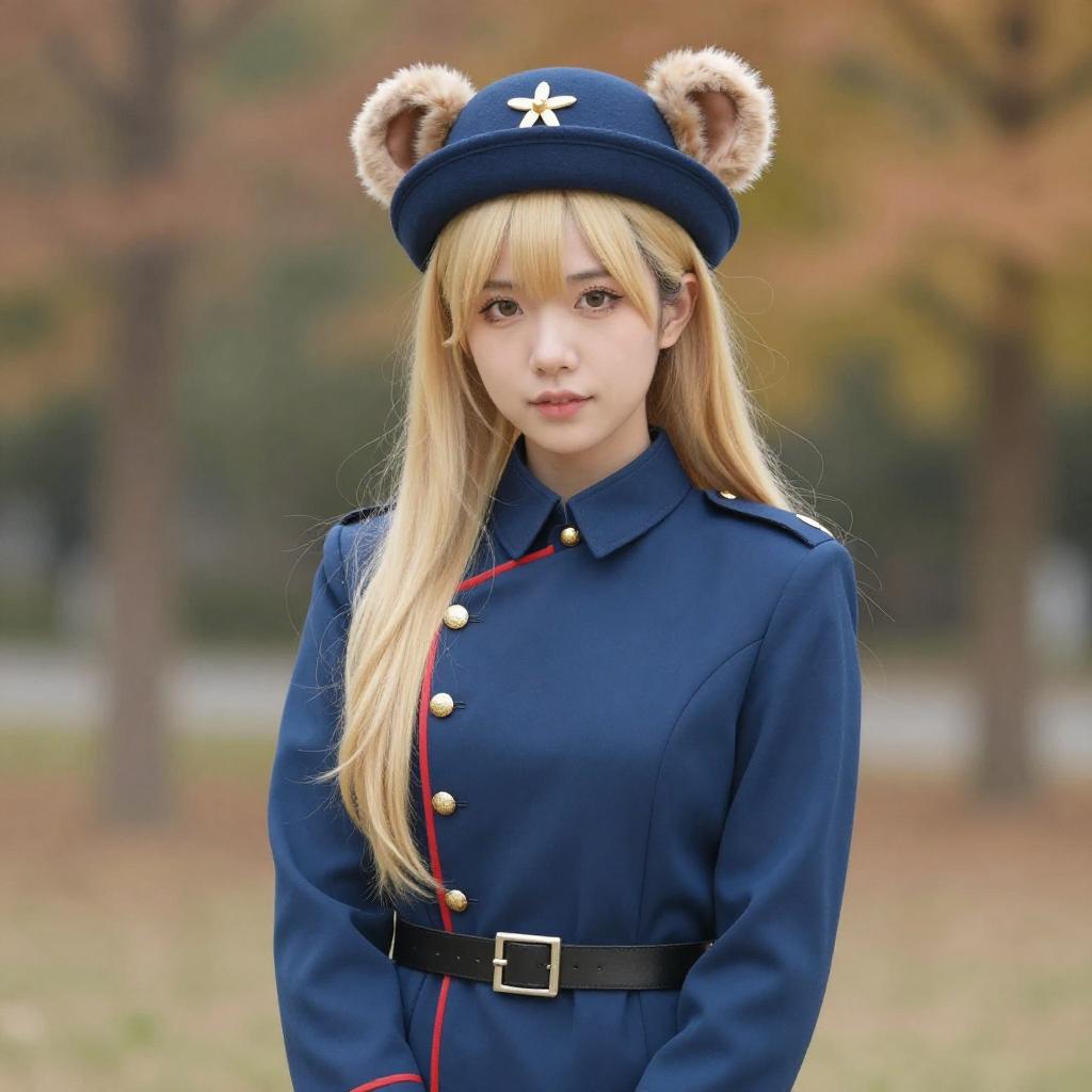 A young woman with long blonde hair is dressed in a formal blue military-style uniform adorned with gold buttons and red piping. She wears a matching hat featuring furry bear ears, blending a classic military look with whimsical, playful elements against a blurred autumnal background.