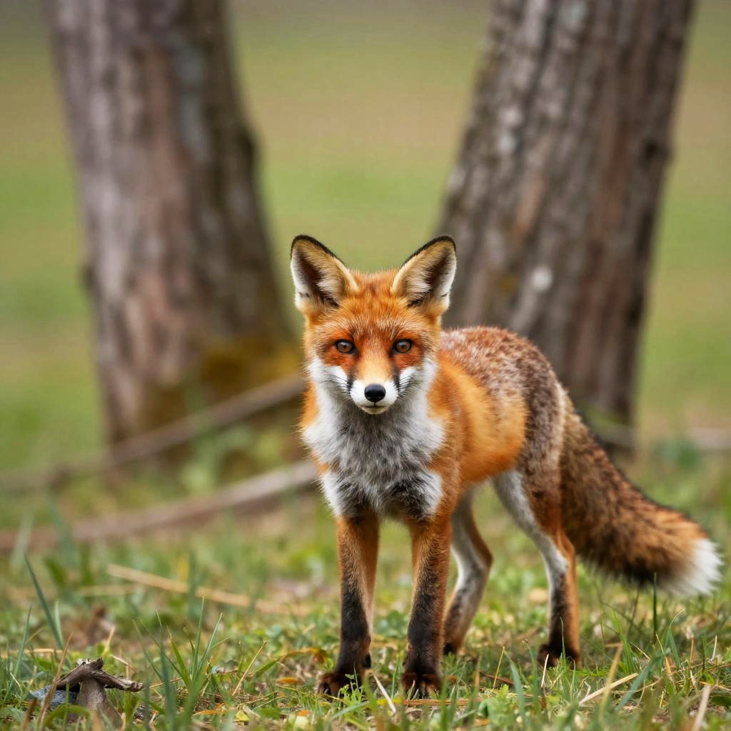 Wildlife Photography 8k photo captured with a high end 80mm lens and a soft focus filter, warm tones, playful red fox kit, bright orange fur, bushy tail, curious playful pose, alert ears, youthful features enjoying a sunny day at the park, tall trees and green grass in the background, natural light should illuminate the scene, with a gentle fill flash to accentuate the dog's features,