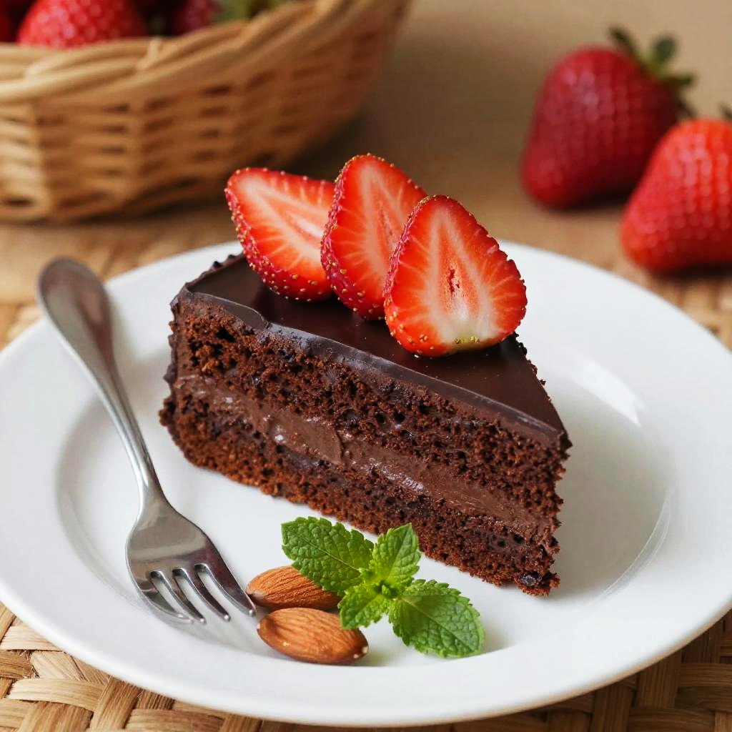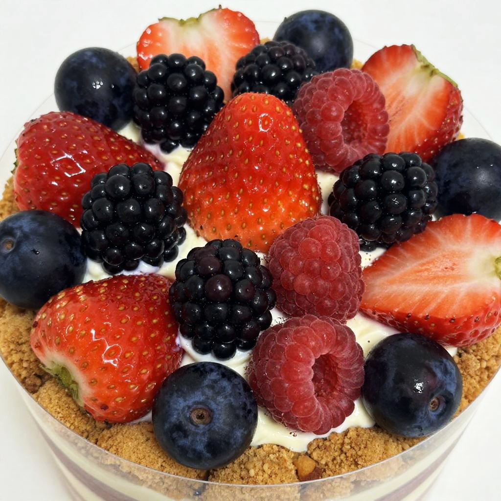Close-up of a round cake featuring a crunchy, textured nut and seed crust. The cake is topped with vibrant, fresh red strawberries, some sliced to show the juicy interior, and garnished with green mint leaves. The creamy layer beneath the strawberries contrasts with the crust, highlighting the vibrant colors and fresh ingredients.