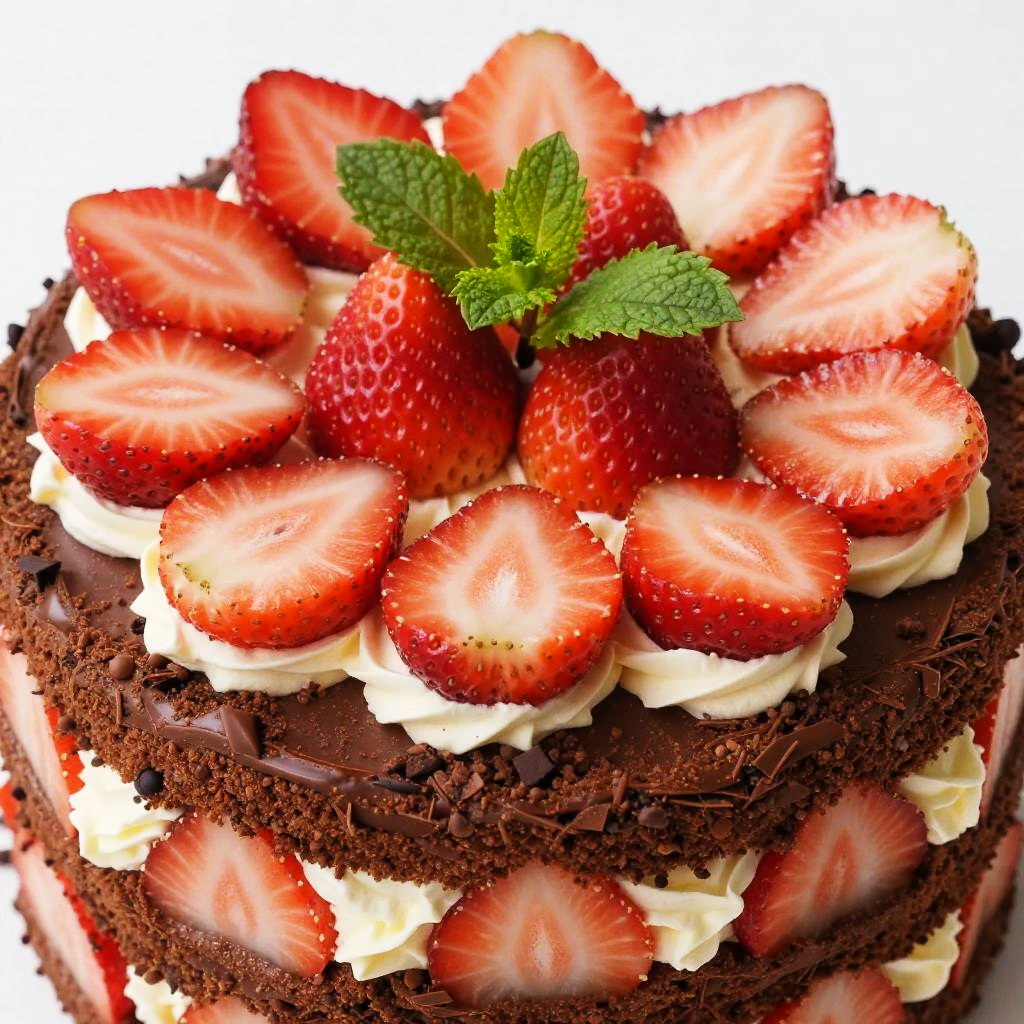 This is a close-up photo of a round cake with a textured, nutty crust topped with a vibrant layer of fresh, sliced strawberries and green mint leaves. The strawberries are bright red and glistening, while the crust appears crunchy and speckled. The image has a high contrast and vibrant colors, making the strawberries and mint leaves pop against the cake.
