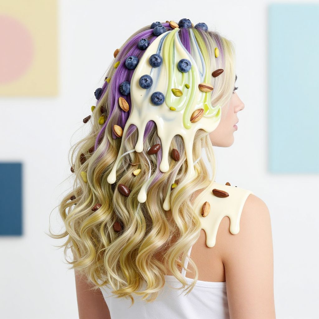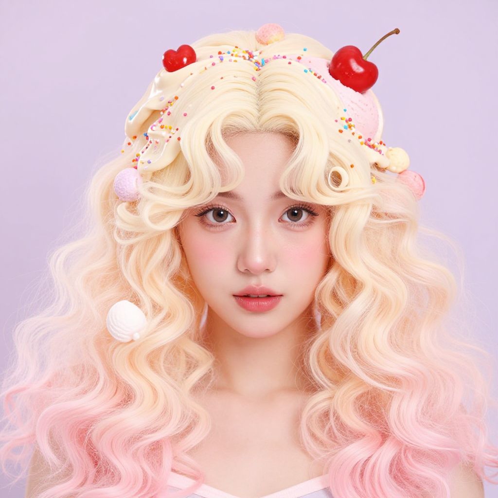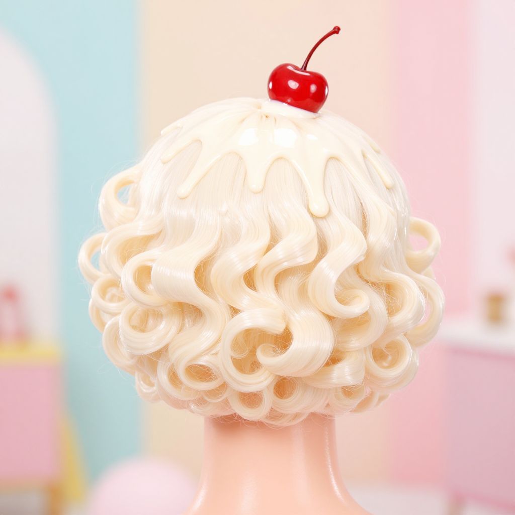 Ice cream hair style with glossy curls resembling melting vanilla and strawberry ice cream, topped with a cherry hairpin, subtle drips and waxy shine, styled on a model in a bright, playful studio setup with soft lighting and colorful backdrops.
