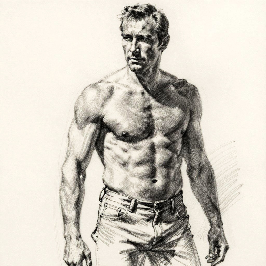 Monochrome charcoal sketch of a strong male form inspired by Sean Connery, nude, showcasing muscular details and shadow interplay, set against a textured paper background with expressive lines.