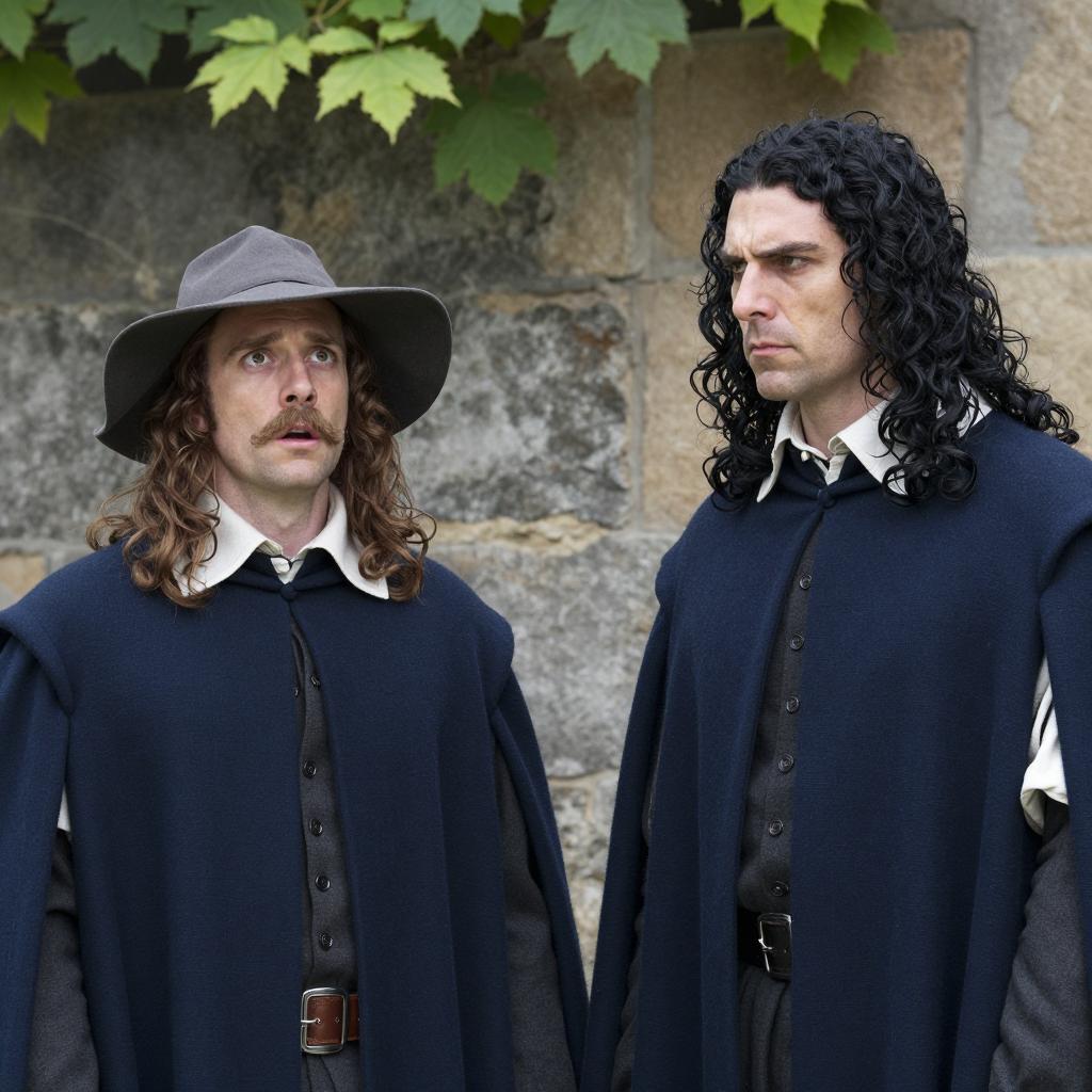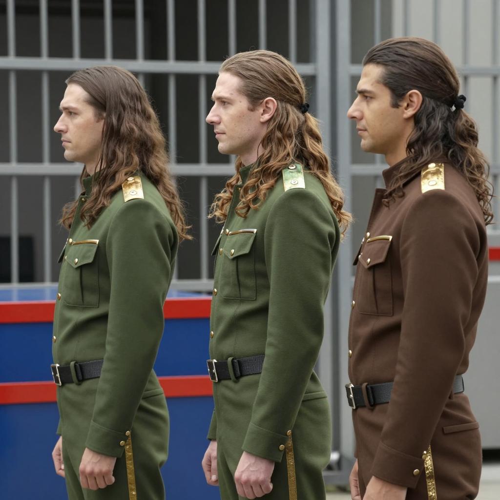 Three men with long brown hair stand in profile, wearing green and brown uniforms with metallic accents. They are in front of metal bars and a blue and red box. The man on the left faces left, the man in the middle faces forward, and the man on the right faces right. Background includes metal bars and industrial elements.