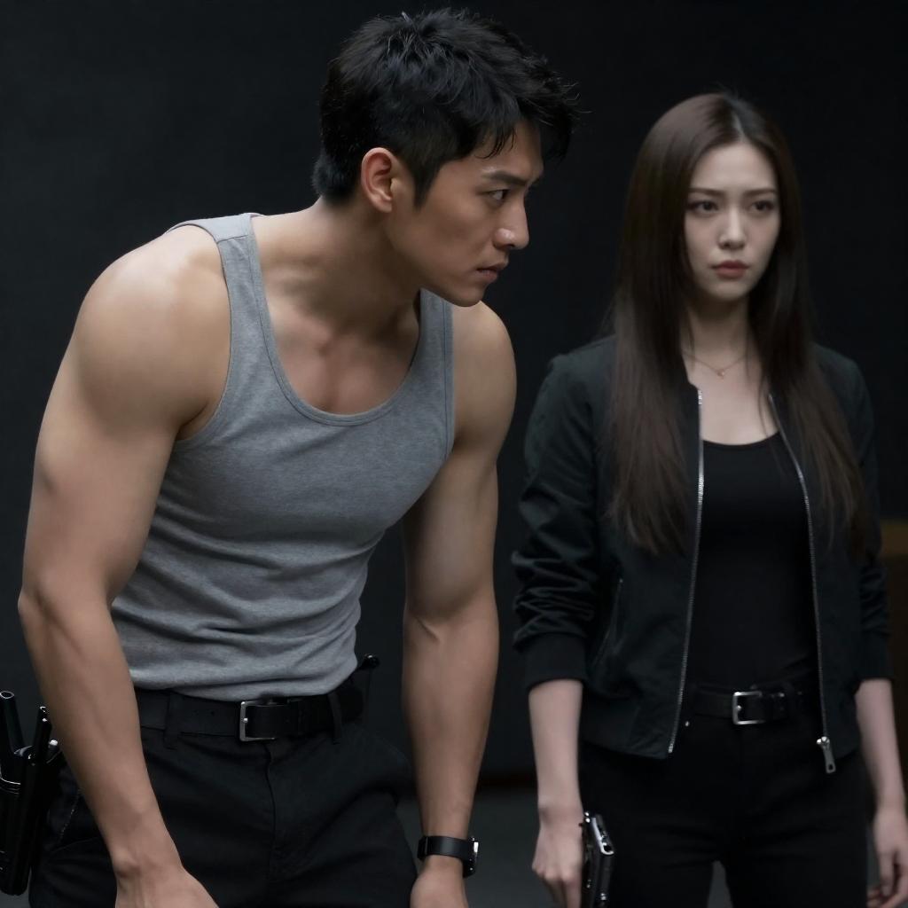 Photograph of two people in dim light. Man with short dark hair, muscular build, gray tank top, black shirt, leaning forward. Woman with long brown hair, serious expression, black jacket, holding a gun, standing to the right. Dark background.