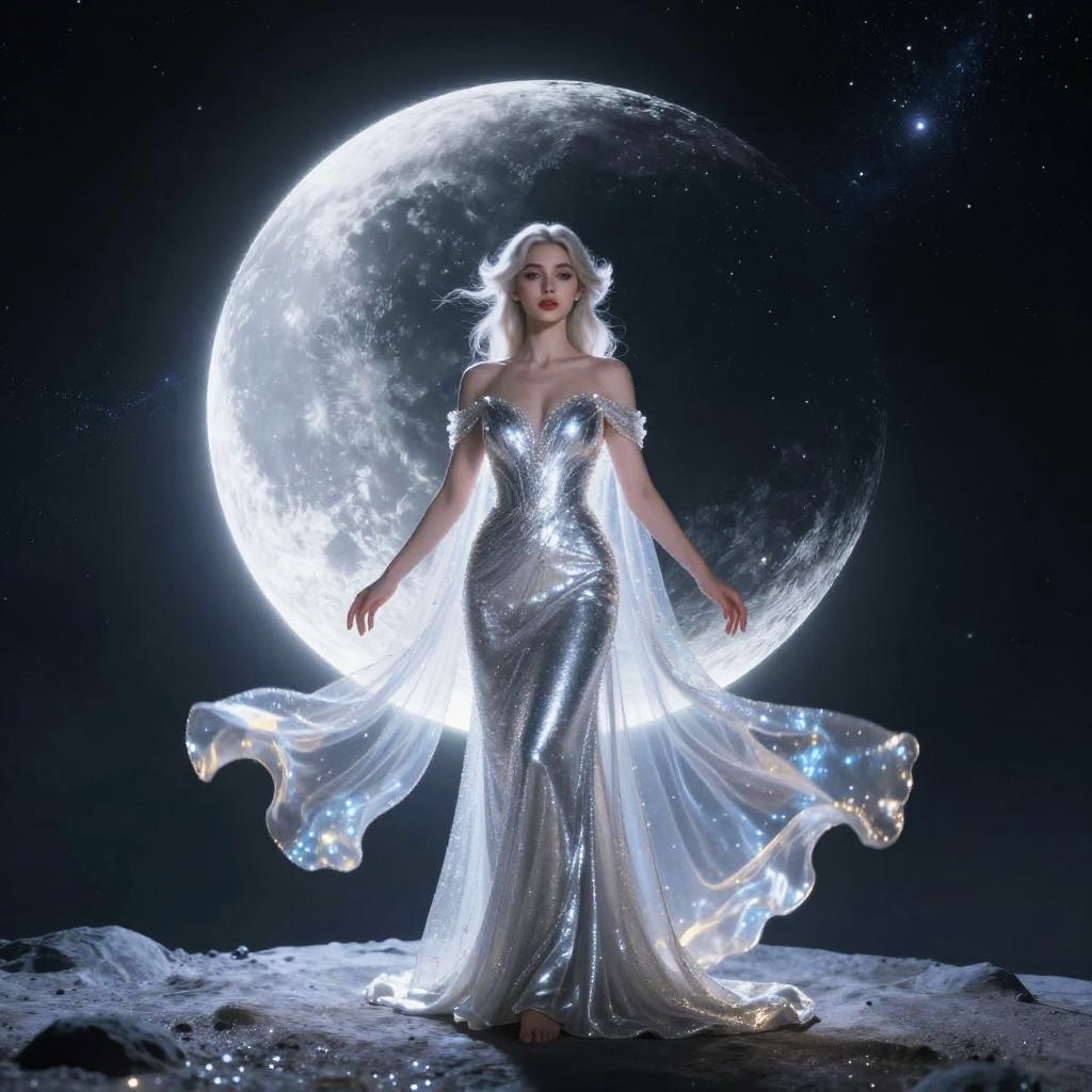 Sexy moon goddess with long silver hair, glowing crescent moon crown, surrounded by sparkling stars and misty clouds, seductive pose on a cliff under full moon night, mystical vibe