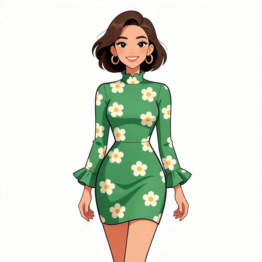 Woman with pretty face and pretty hair. smiling Woman, retro-inspired, mini dress in dark green with ditsy floral pattern, high neckline with ruffle detail, long sleeves with flared ruffle cuffs, fit and flare silhouette, white background. --sref 1467