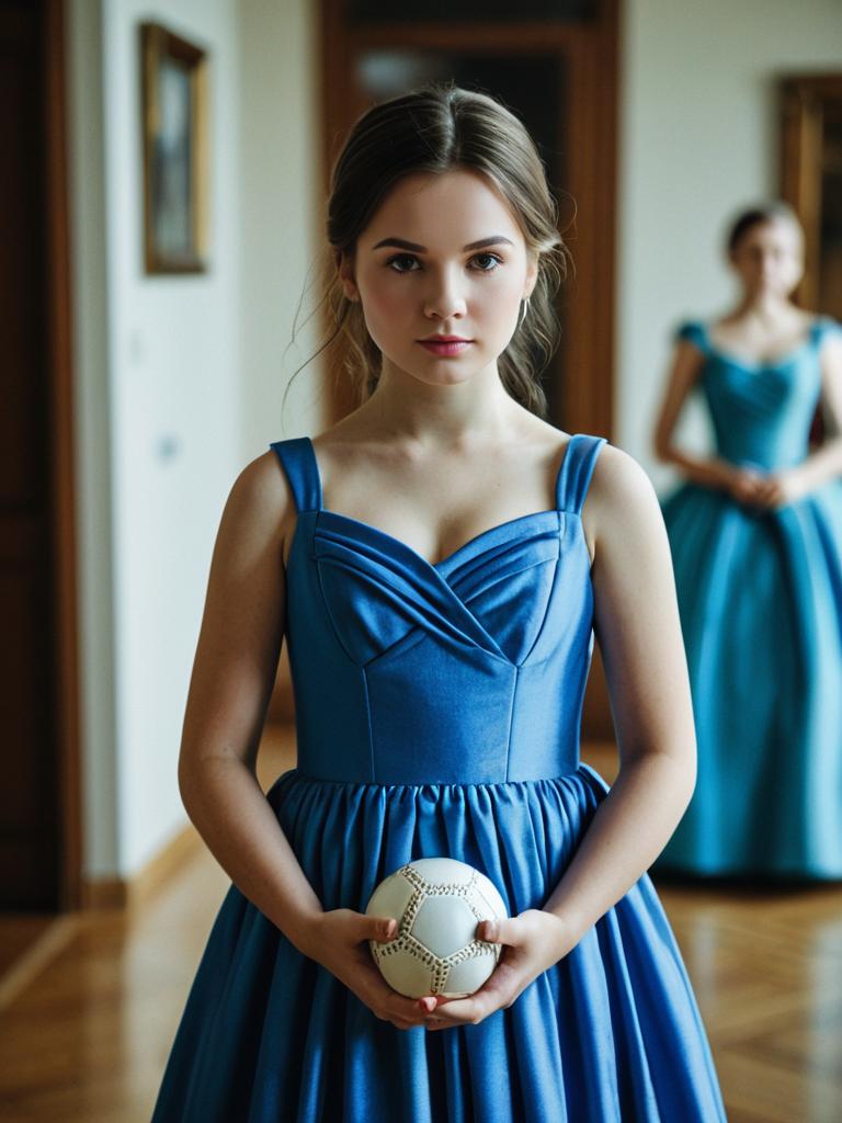 Ball gown year olds, 1girl, dress, solo, blue dress, realistic, breasts, blurry, photorealistic, blurry background, standing, looking at viewer, indoors
