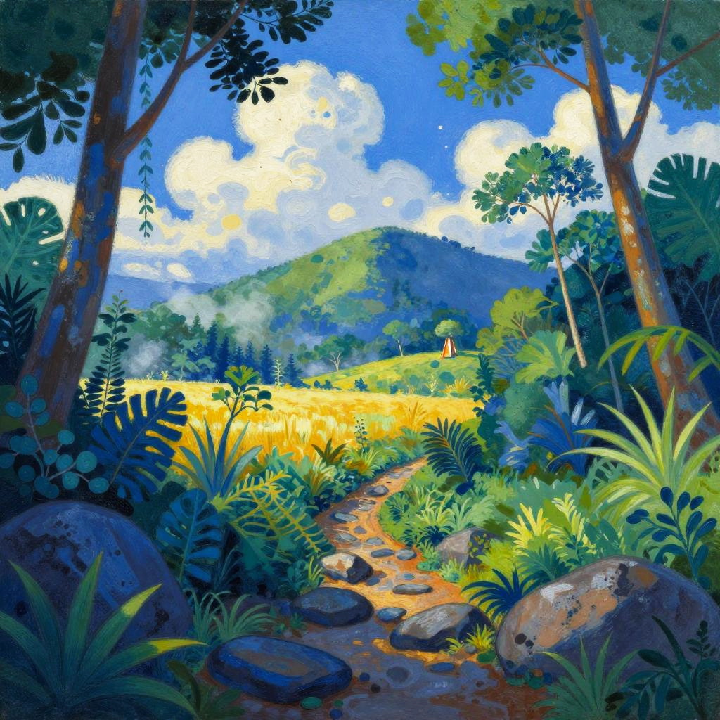 Fauvism landscape painting landscape set in lush jungle clearing at sunrise, bright blue sky with fluffy clouds. Oversized blue-tinted shapes frame a rocky path winding into a glowing golden field; a small landmark rests on a distant hill amid lush greenery. Saturated palette, crisp outlines, dithered textures, soft bloom, subtle fog, playful particles, storybook charm, wild and vibrant.