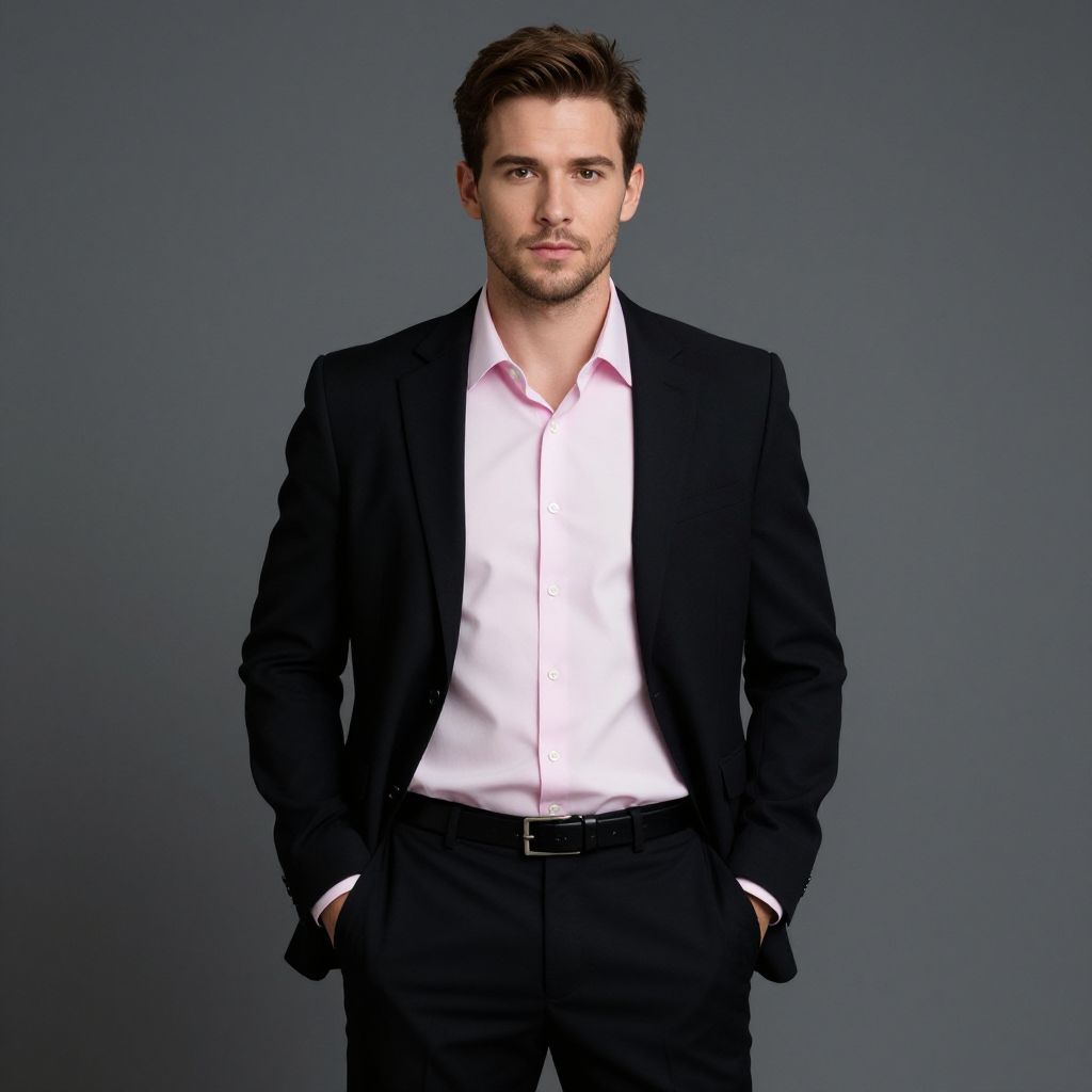 "smart casual party dress, 1boy, male focus, solo, shirt, jacket, belt, black jacket, facial hair, pants, hands in pockets, looking at viewer, brown hair, collared shirt, black pants, suit, formal, black belt, realistic, short hair, pink shirt Realistic photo of casual sexy person with pretty face"