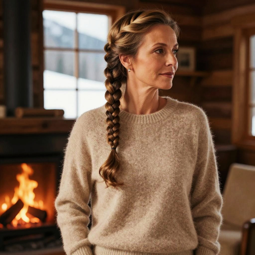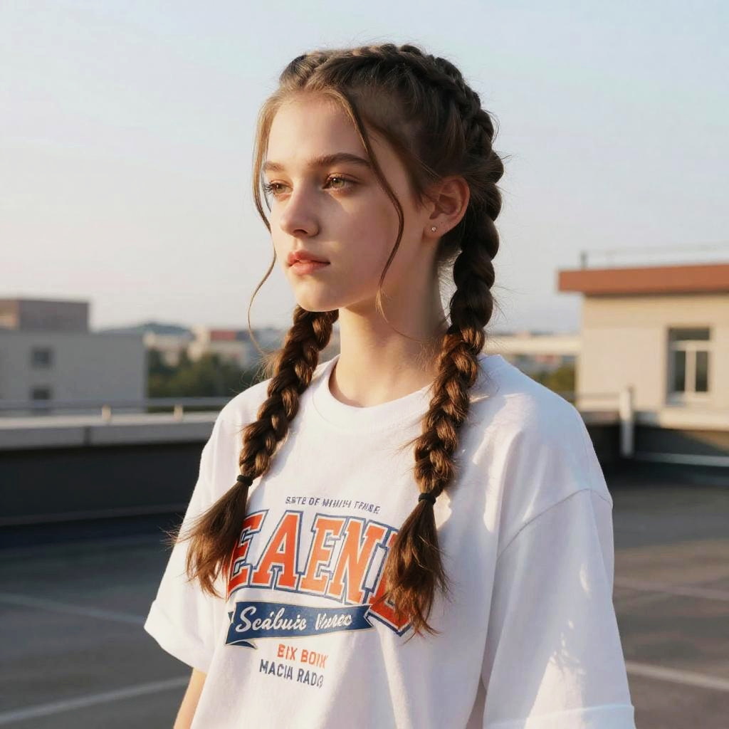 Half Braids hairstyle on young man, wearing denim jacket, in music festival, captured in fashion editorial style with soft ambient light.