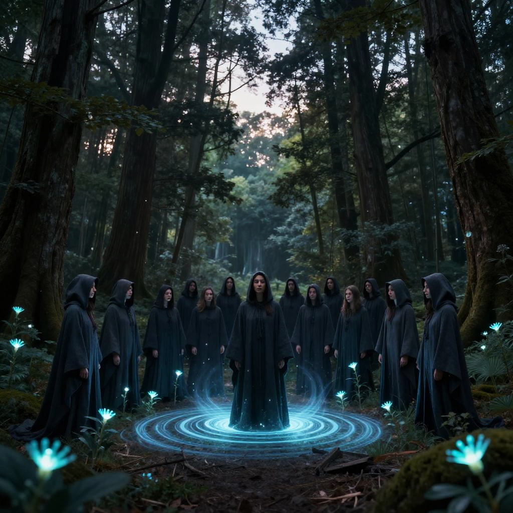 A close-up of the Sleep Token choir singing under a night sky filled with stars and constellations, wearing matching black and silver robes. The scene has a cinematic, atmospheric vibe with subtle mystical elements like glowing runes and ethereal smoke.