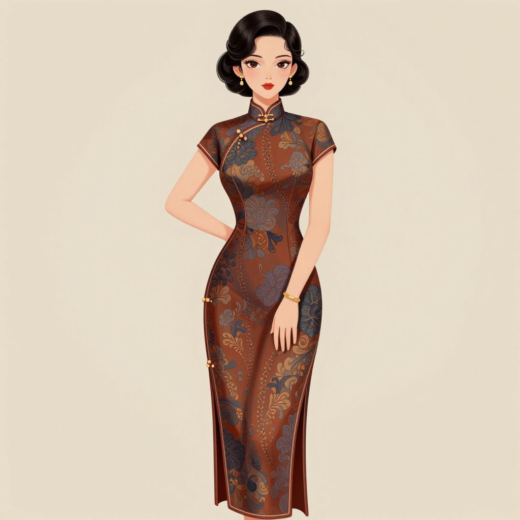 A vintage-inspired illustration showcases a woman elegantly dressed in a Geritie Qipao cheongsam dress, featuring a rich, patterned fabric and classic styling, rendered in a clean, high-definition digital art style with soft lighting and a timeless aesthetic.