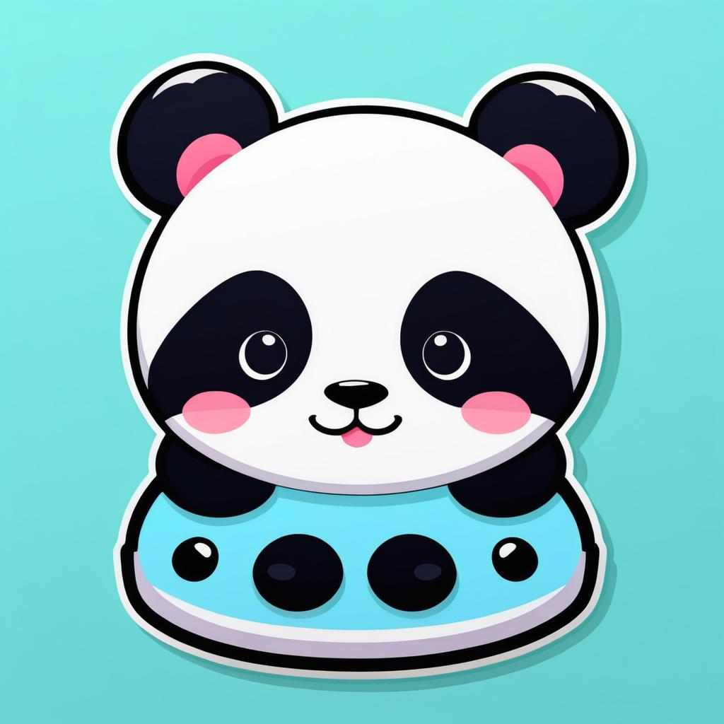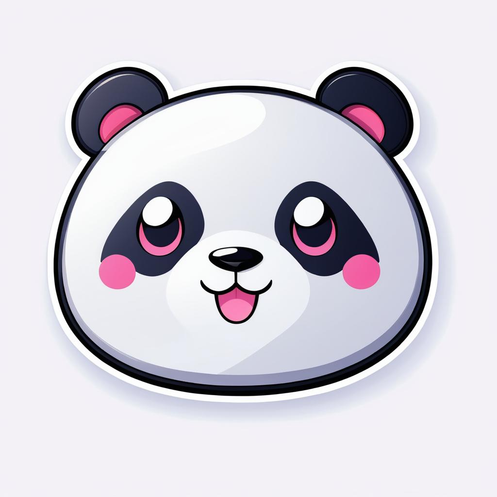 A cute kawaii style panda face icon designed as a die-cut cartoon sticker. The panda features large black ears, black eye patches with shiny highlights, round pink cheeks, a small black nose, and an open mouth with a pink tongue. The design is a 2D vector illustration inspired by anime art style.