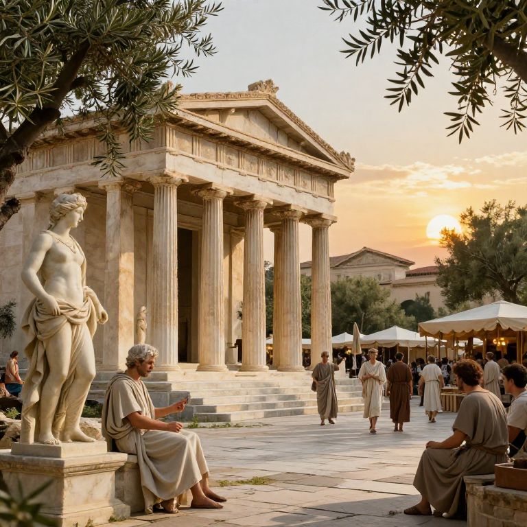 Helenism ancient era, vibrant classical Greek city with marble temples, philosophers debating, olive trees under a golden sunset, intricate Hellenistic art and sculptures, lively agora market scene, soft natural lighting, highly detailed and atmospheric
