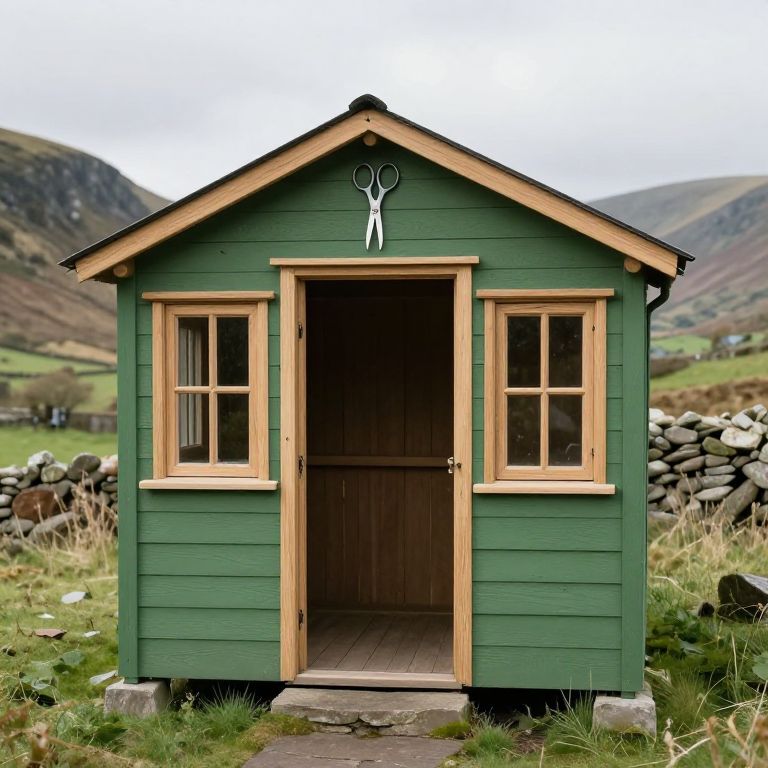 Embroidery Scissors imagine a shed, painted green, with door frame and window frames in light oak, pent roof sloping front to back, overlooking the Tanat Valley in Wales,