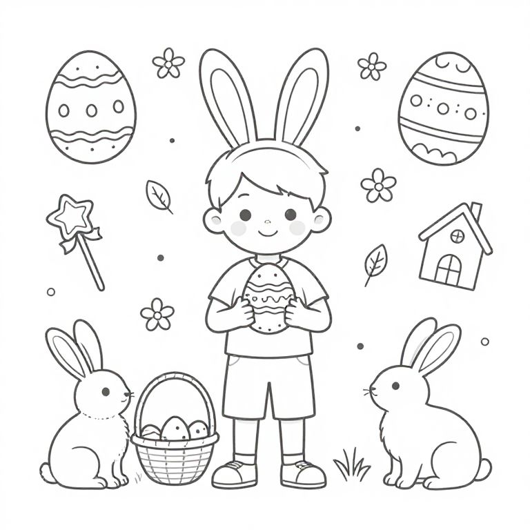 The image is a line art illustration of various Easter festival items arranged in a playful and organized manner. At the center, a young boy with bunny ears holds a decorated Easter egg, surrounded by a variety of Easter-themed objects. To his left, a small rabbit sits on the grass, while to his right, another rabbit stands alert. Above the boy, two Easter eggs with intricate patterns are depicted, one of which is being held by him. Below the boy, a basket filled with eggs is placed, and nearby, a lollipop with a star-shaped top adds a sweet touch. Scattered around the scene are flowers, leaves, and a small house, enhancing the festive atmosphere. The overall composition is balanced, with objects arranged in a way that guides the viewer's eye through the image, creating a sense of depth and interaction between the elements.