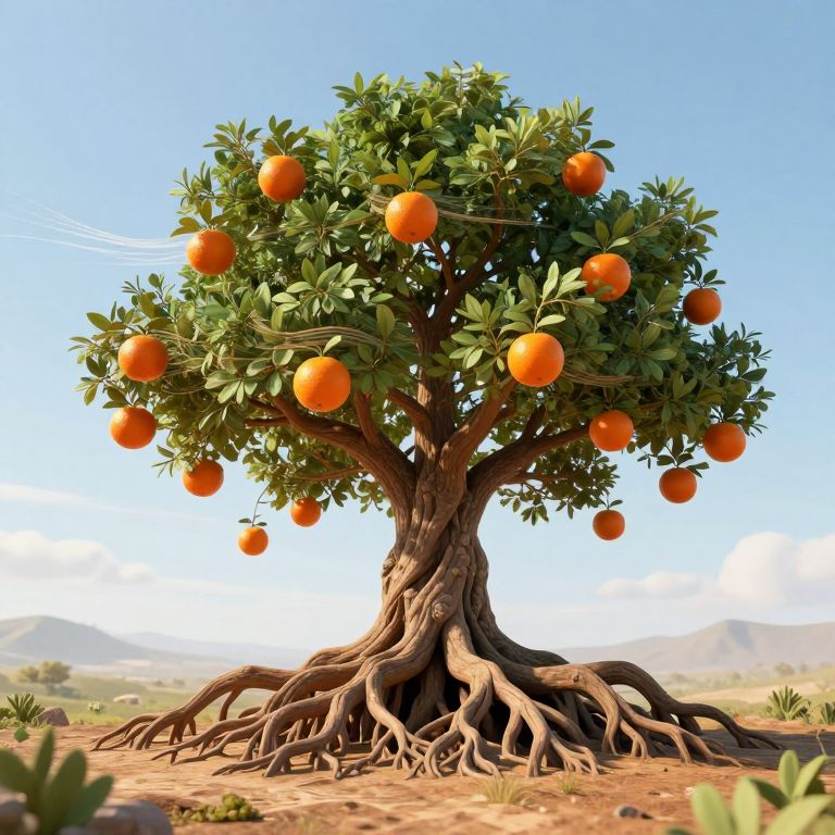 Photorealistic digital artwork of a vibrant orange tree with a thick, gnarled trunk and sprawling roots. The tree is adorned with numerous bright orange fruits, hanging from green, glossy leaves. The background features a clear blue sky, distant mountains, and a dry, sandy landscape with sparse vegetation. The sunlight casts sharp shadows, enhancing the tree's textured bark and the fruits' vivid color. The scene exudes a sense of natural beauty and tranquility.