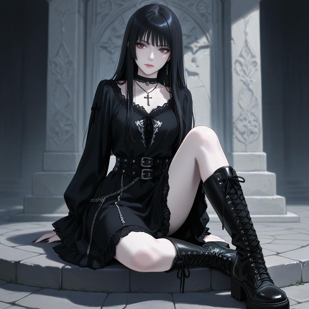 Illustration of a gothic young woman with long black hair, dressed in a black lace-up dress, sheer black tights, and black platform lace-up boots. She is sitting on a stone step in a dimly lit architectural setting with columns, wearing dark makeup and a cross necklace.