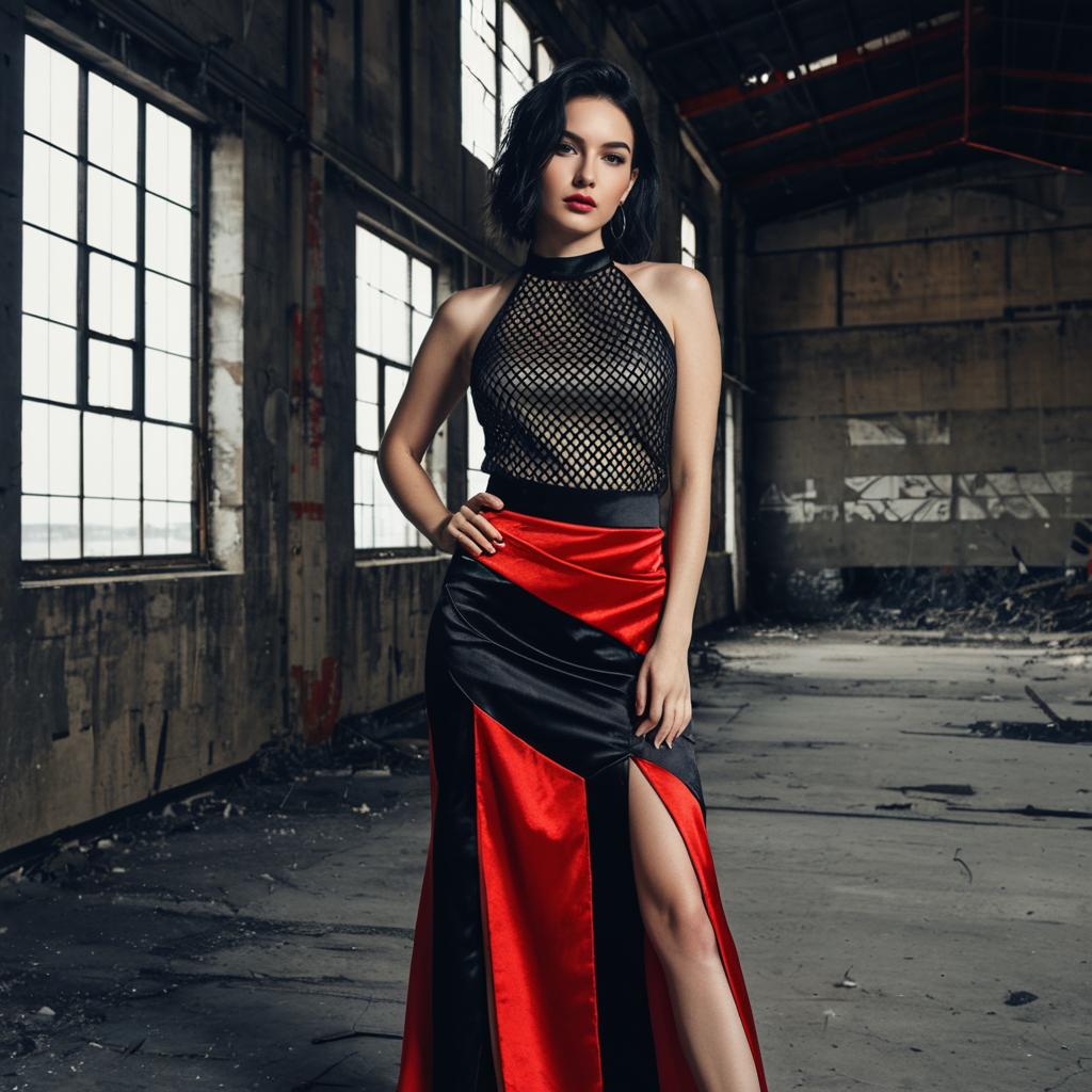 Woman, modern edgy, mesh black halter neck with bold geometric designs, bright red satin wrap skirt with off-center slit, abandoned industrial warehouse with textured walls
