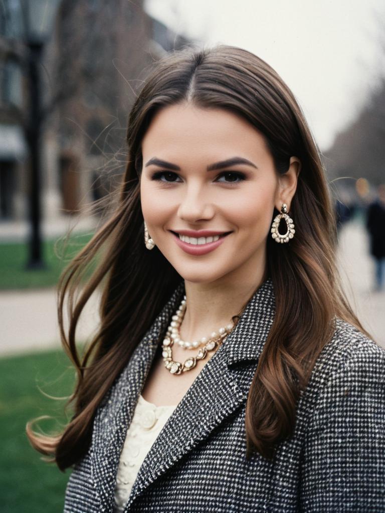 Winter tops woman costume, 1girl, solo, looking at viewer, realistic, brown hair, upper body, smile, black hair, lips
