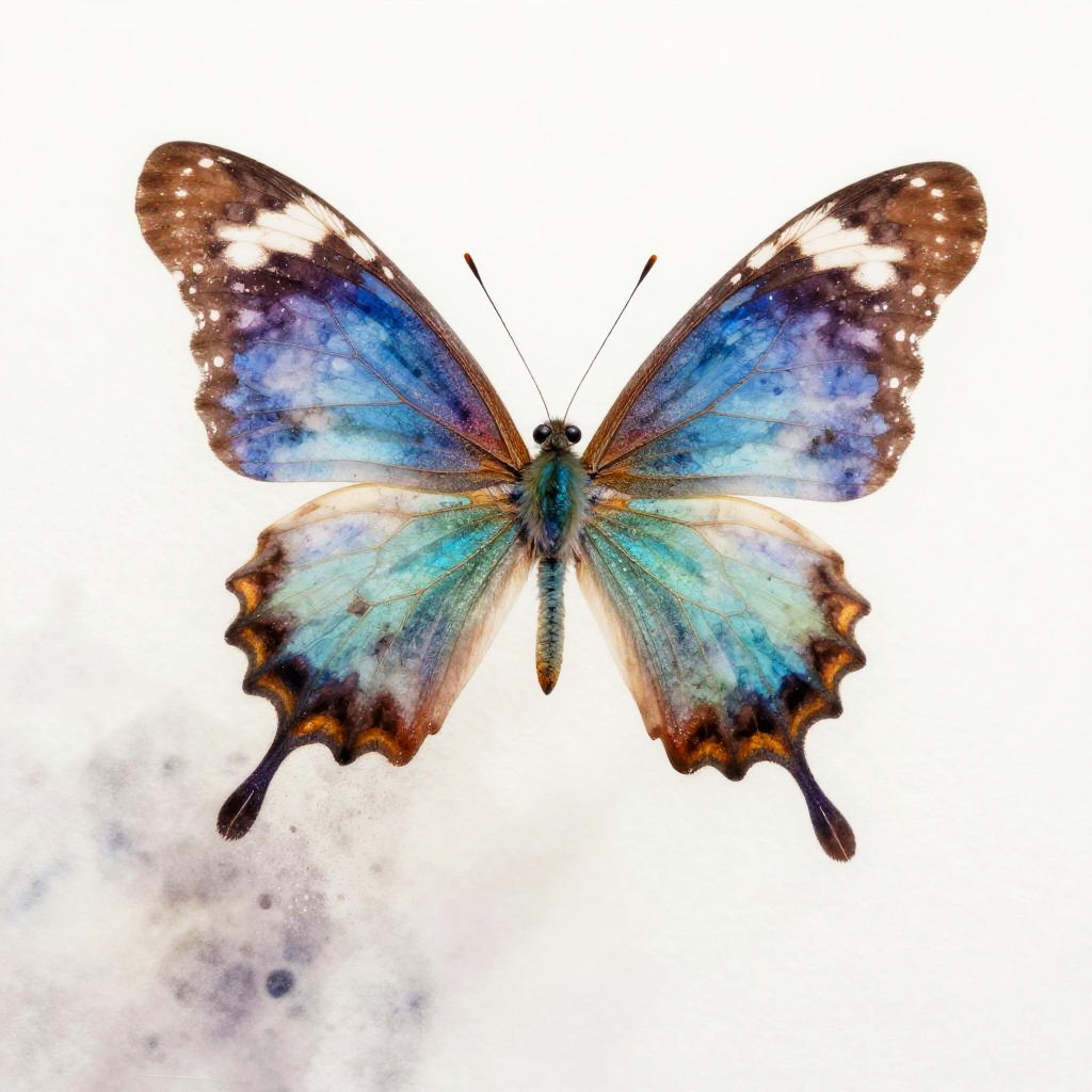 Digital artwork of a vibrant butterfly with blue, teal, and brown wings, speckled with white dots, against a white background.