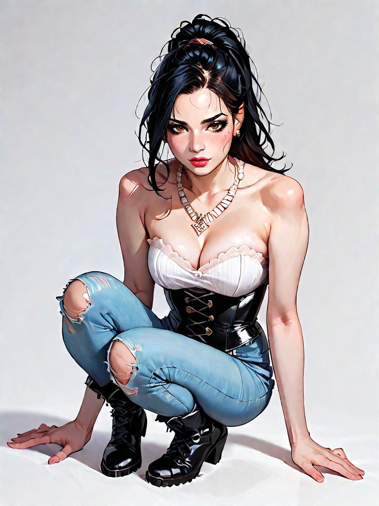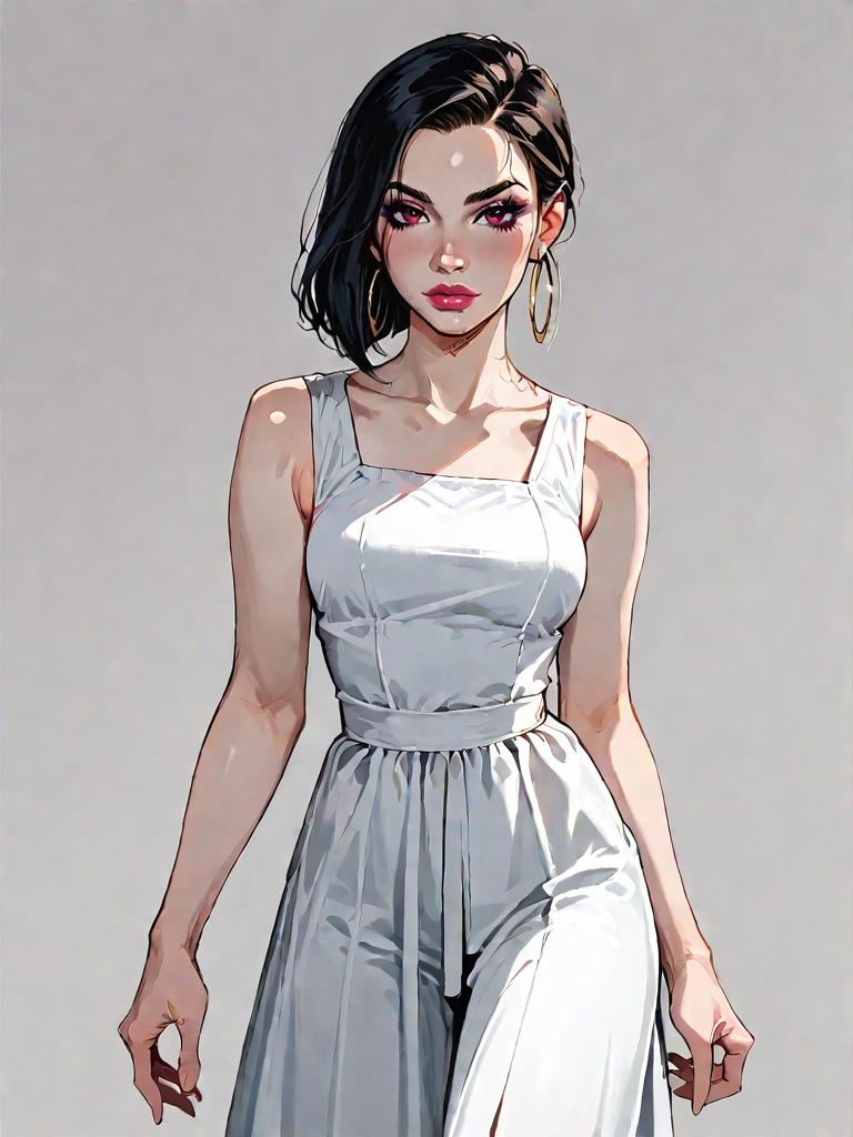 Digital artwork of a realistic young woman with long black hair, sitting on her knees against a gray seamless background. She wears a fitted casual mini dress with spaghetti straps in light blue and white tones, featuring a ruched front with drawstring detail. The woman has light natural makeup with subtle pink lips and minimal jewelry, showcasing a chic yet relaxed style.
