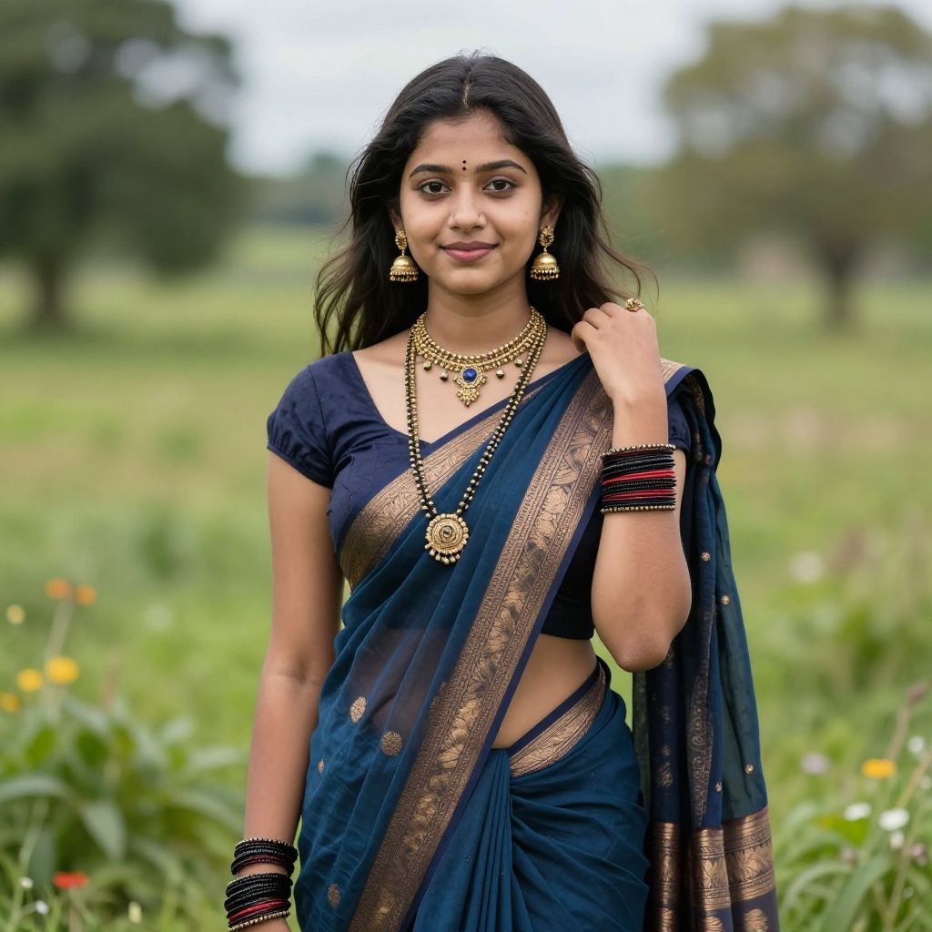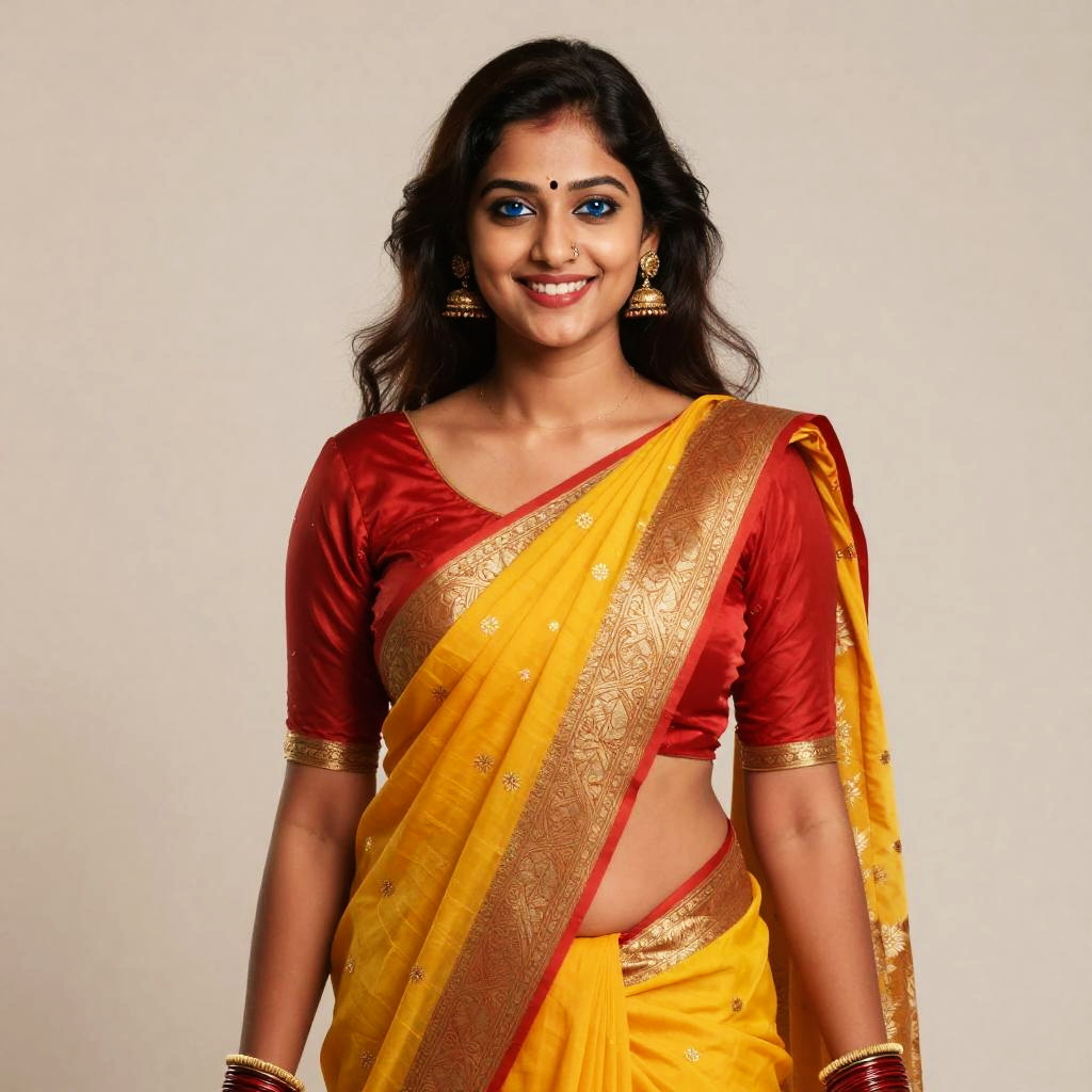 Extremely beautiful Ireland girl, 19 year old, front view, HDR, look at viewer, Light smile, Various earrings, Variety of necklaces, Various bracelets, saree, blouse, long skirt, navel, cleavage, eyes symmetry, face symmetry, various outdoor locations, hyper realistic, yocto-pixel detailing, yotta-pixel image