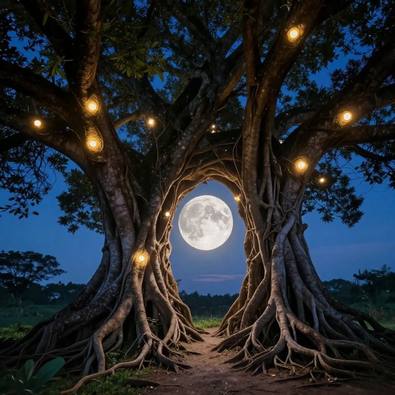 Majestic tree stands ancient and hollow, its gnarled branches adorned with glowing orbs, roots forming a radiant archway that cradles a luminous full moon, set against a starlit twilight sky.