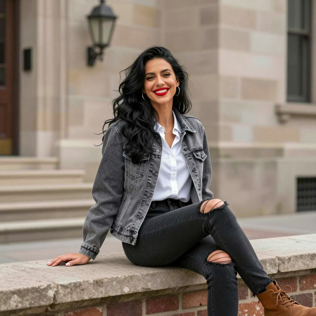 Young woman with long black hair, smiling, standing sideways on cobblestone path. Black long-sleeve top, tight dark jeans, black ankle boots with high heels. Black shoulder bag on right. Iron fence with vertical bars on left, stone building on right. Clear blue sky in background. Natural light.
