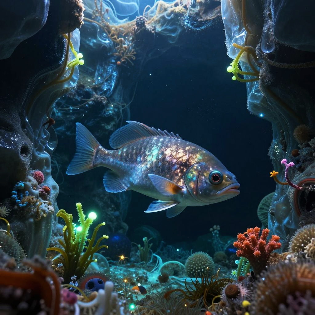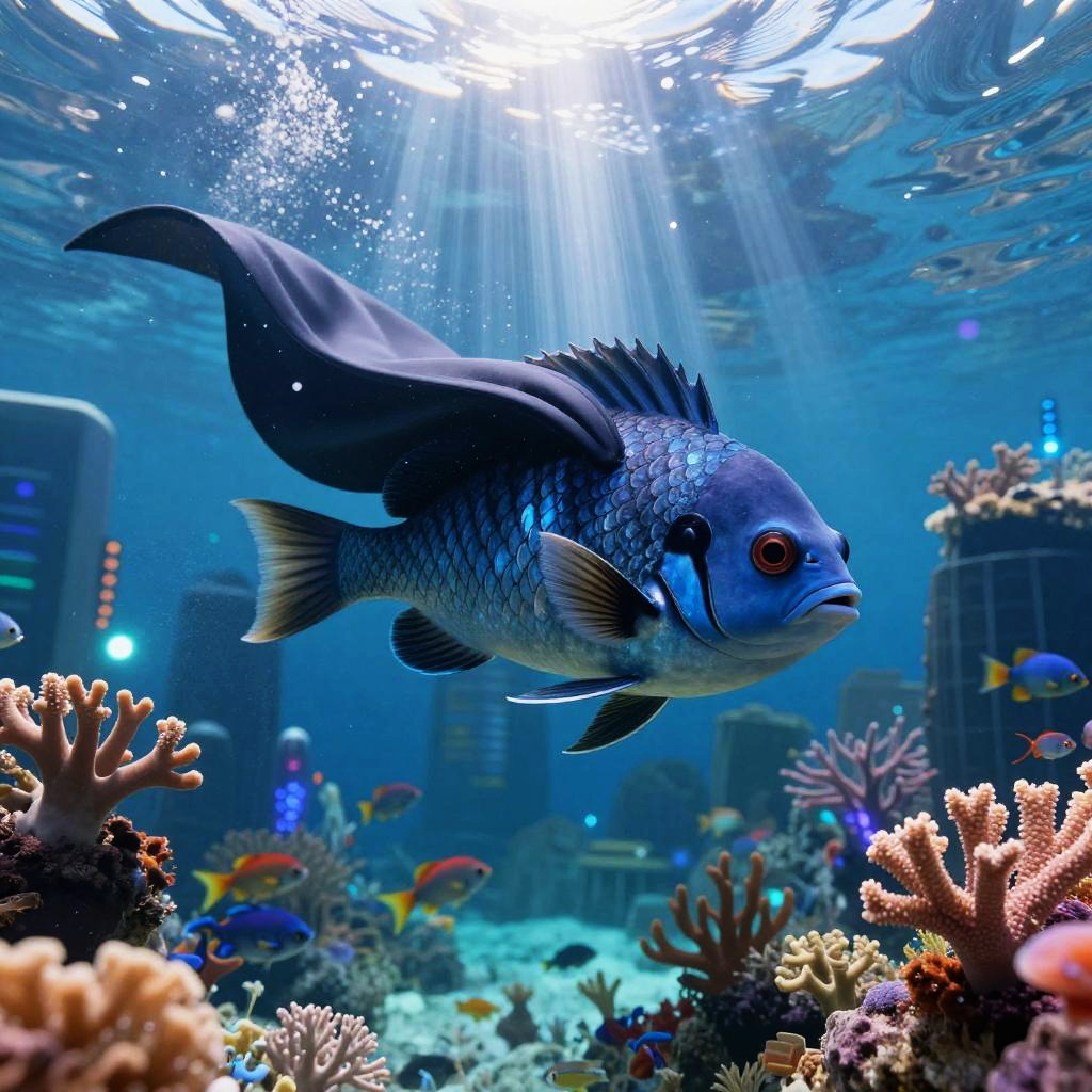 Fantasy-inspired cute creature generator depicting an adorable aquatic creature with translucent fins and glowing scales, swimming gently among vibrant coral reefs with shafts of sunlight penetrating clear ocean water.