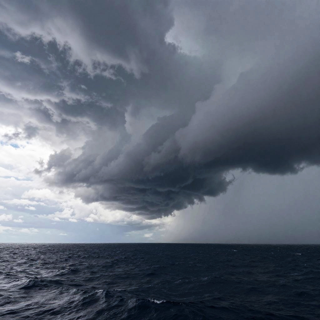 Photograph of a stormy ocean scene with dark, swirling clouds covering the sky. The clouds are heavy and dense, creating a dramatic contrast against a bright, overexposed patch of sky on the left. The ocean is dark blue, with small waves visible on the surface. The overall mood is tense and foreboding, with the storm clouds looming overhead.