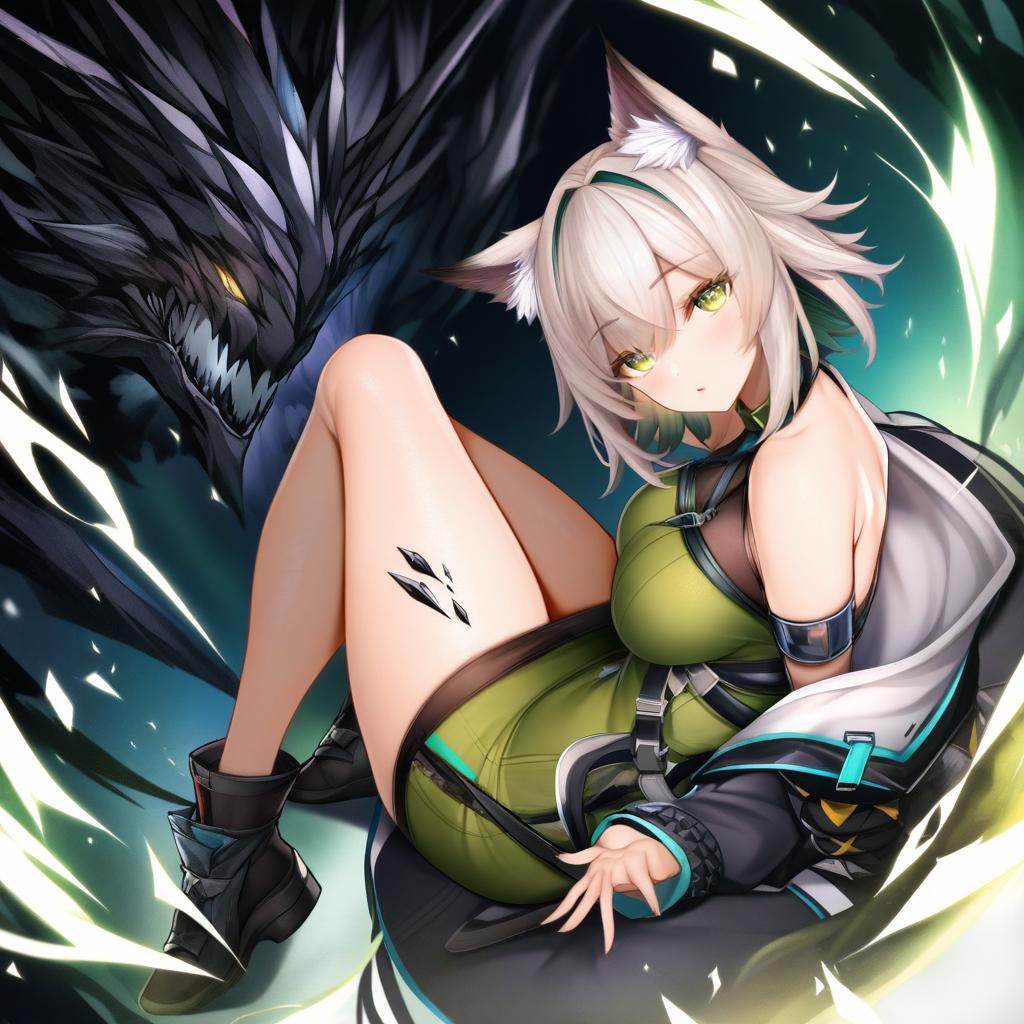 Mon3tr (arknights), arknights, 1girl, cat girl, monster, cat ears, animal ear fluff, green eyes, short hair, green hair, grey hair, white hair, green dress, bare shoulders, long sleeves, oripathy lesion (arknights), by artist oni-noboru, animagine