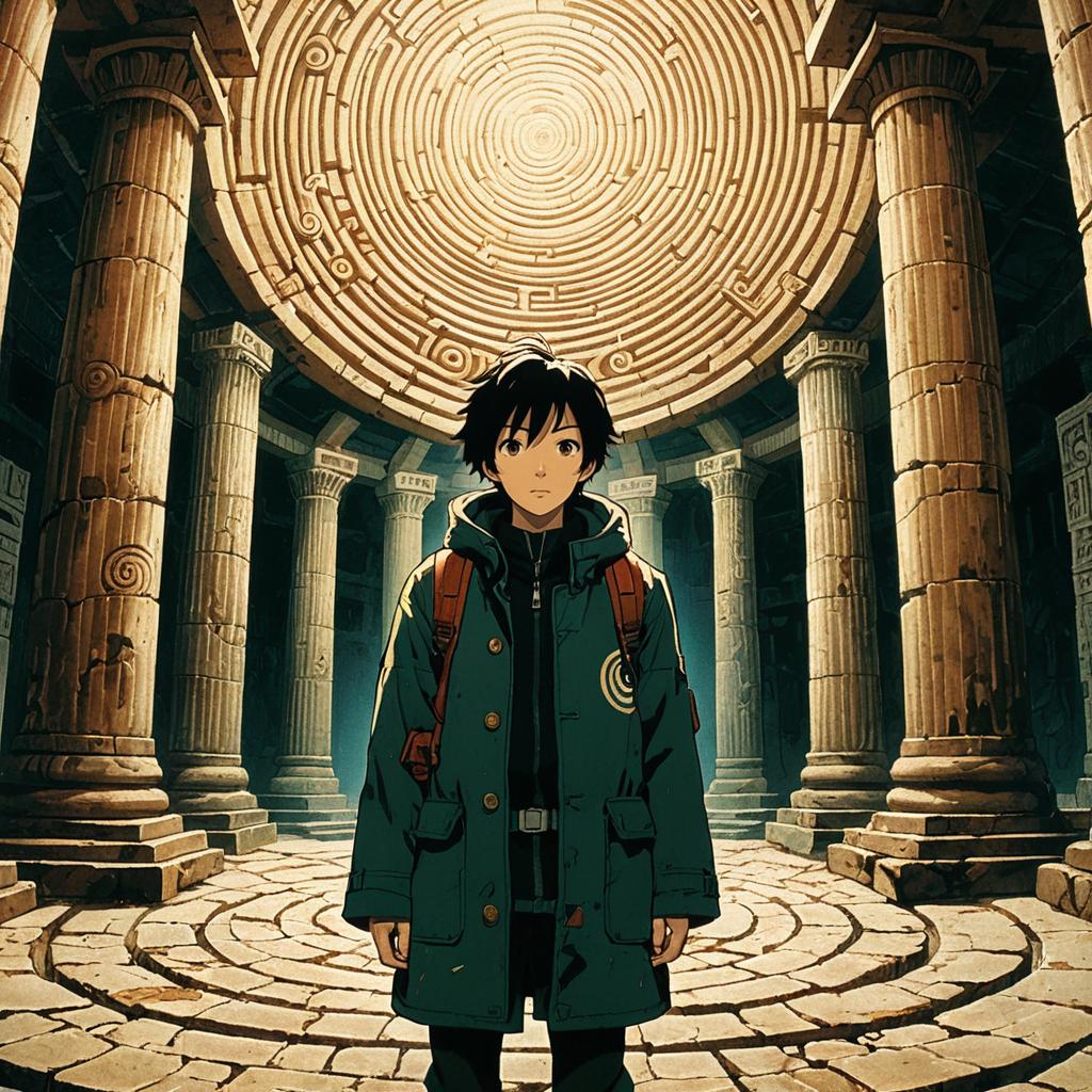 A thoughtful young mage apprentice, wearing a flowing robe with arcane symbols, interacting with a small mischievous sprite with glowing wings, in an ancient stone courtyard bathed in moonlight, drawn in the magical and whimsical anime style of Hayao Miyazaki.