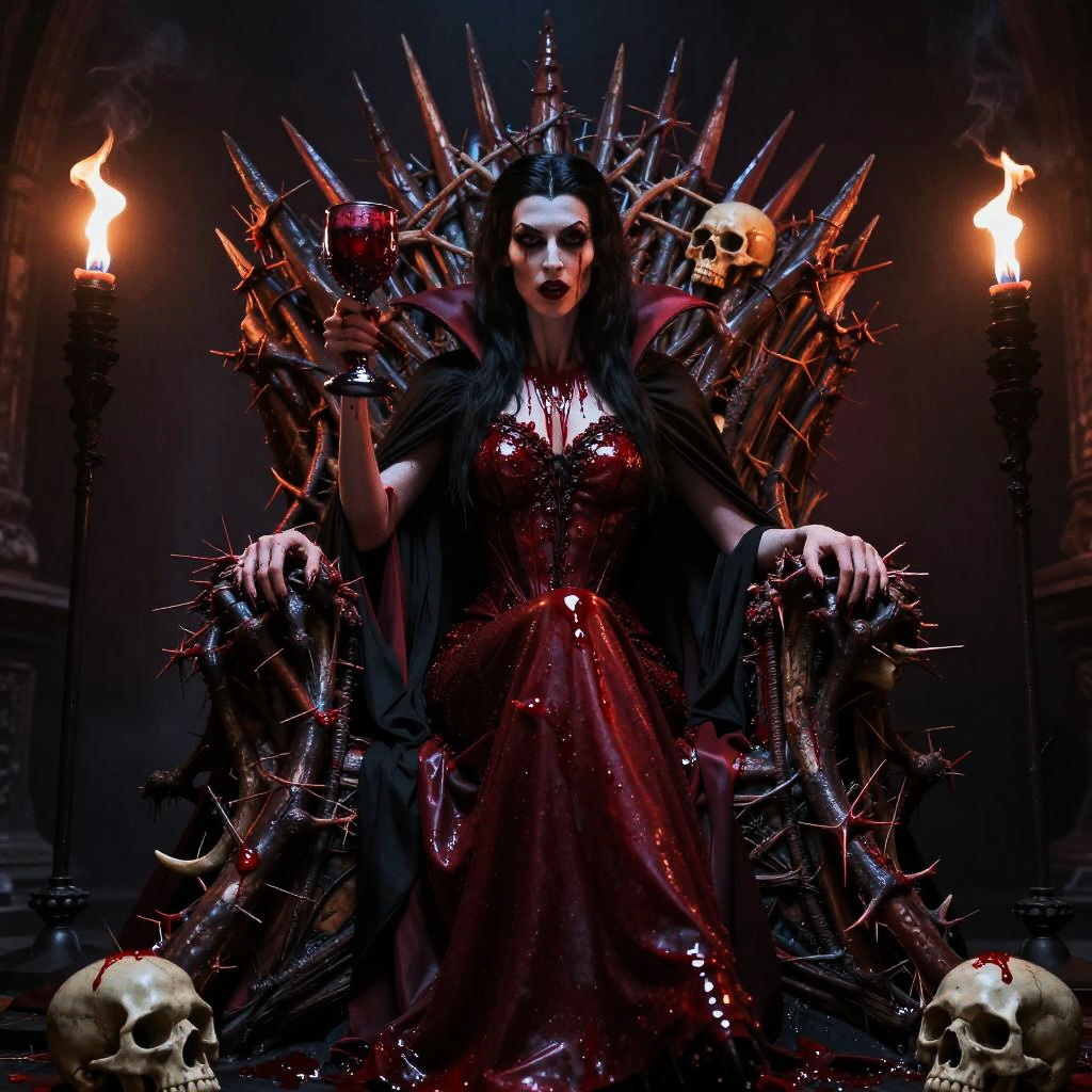 Dark vampire throne made of twisted thorns and skulls, drenched in deep red hues, an imposing vampire queen holding a goblet of blood, flickering torches casting haunting lights