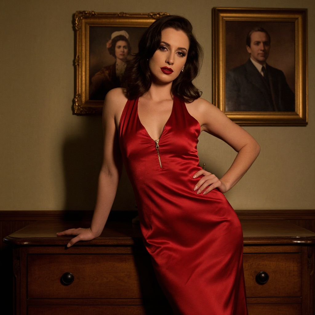 Sultry woman posing confidently in a red satin dress with a gold zipper, illuminated by warm lamplight in a vintage-inspired room featuring a wooden dresser and framed portraits on the wall.