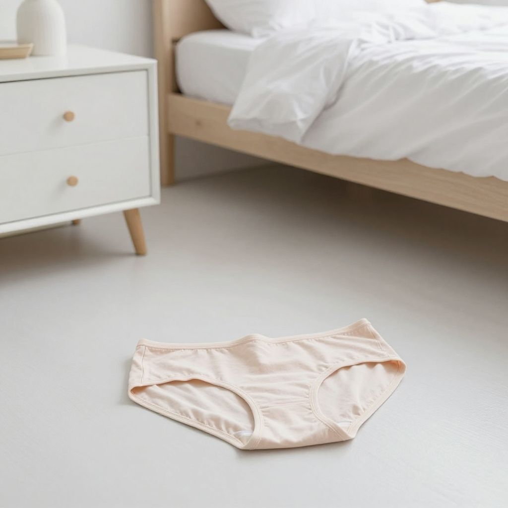 Photograph of a minimalist bedroom. A light wooden bed with white rumpled sheets occupies the right side. A white nightstand with a single drawer and wooden knob is on the left, featuring a small white lamp. On the smooth, light grey floor in the foreground, a pair of peach-colored panties is neatly folded. The room is brightly lit with natural light, emphasizing the clean and simple aesthetic.