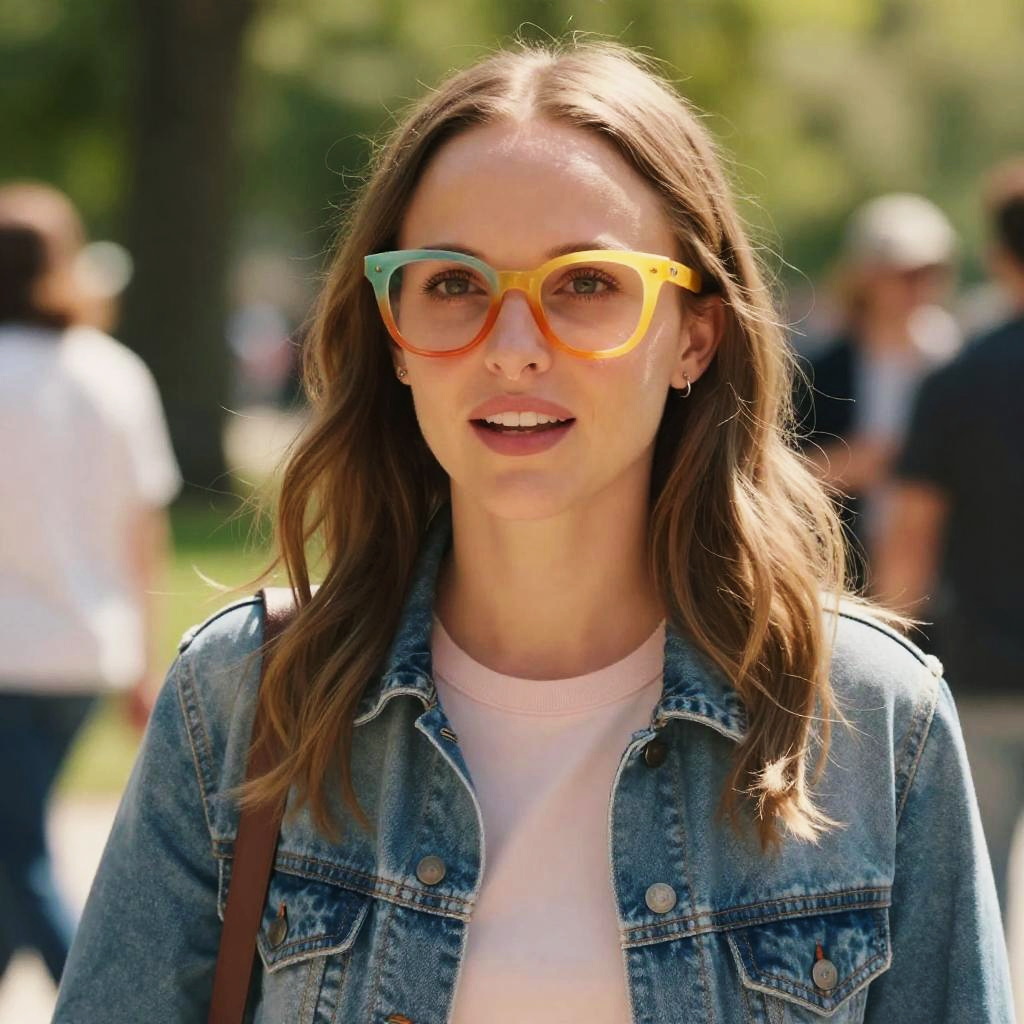 Natalie Portman glasses, oversized colorful frames, sunny outdoor park, casual chic outfit, vibrant and lively mood, candid moment captured with cinematic flair