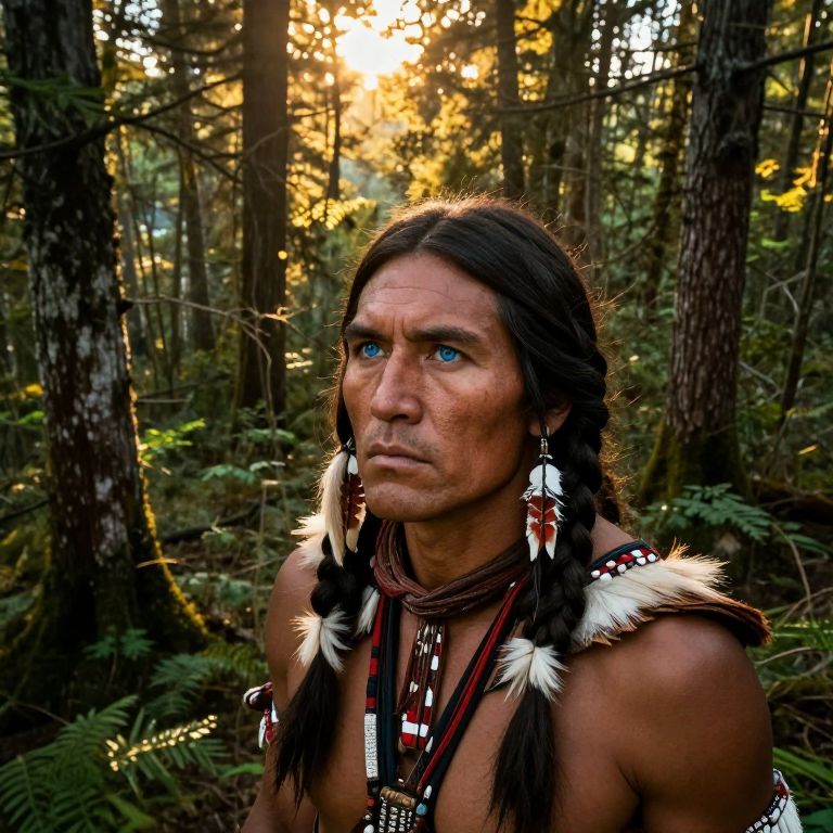 Photograph of a Native American man with long, dark braided hair and blue eyes, standing in a forest during sunset. He has a tanned, muscular build and wears traditional attire with white and red feathered adornments on his chest and shoulders, and long beaded necklaces. His expression is serious and contemplative. The background features tall trees and dense greenery with sunlight filtering through the branches, creating a warm, golden glow. The image has a vibrant, realistic style with high contrast and rich colors.