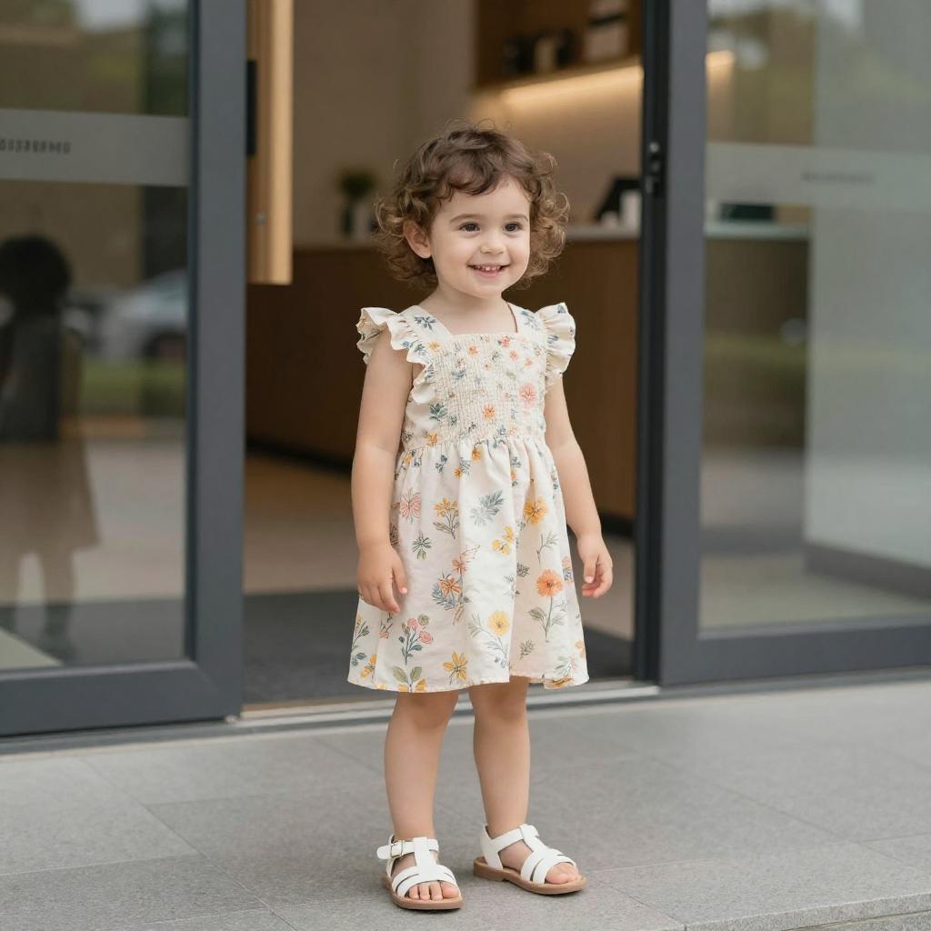 A young toddler girl standing outdoors near a modern building entrance with glass doors. She is smiling warmly, wearing a light-colored floral sundress with ruffled sleeves and white sandals. The natural soft light illuminates her face and curly hair, creating a warm and relaxed atmosphere.