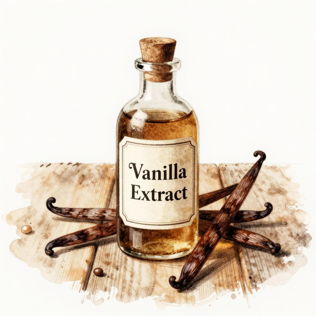 Vanilla extract drawing showcasing a vintage apothecary bottle labeled 'Vanilla Extract', set on a rustic wooden table with vanilla beans scattered around, drawn in warm sepia tones with intricate shading and a touch of watercolor texture.