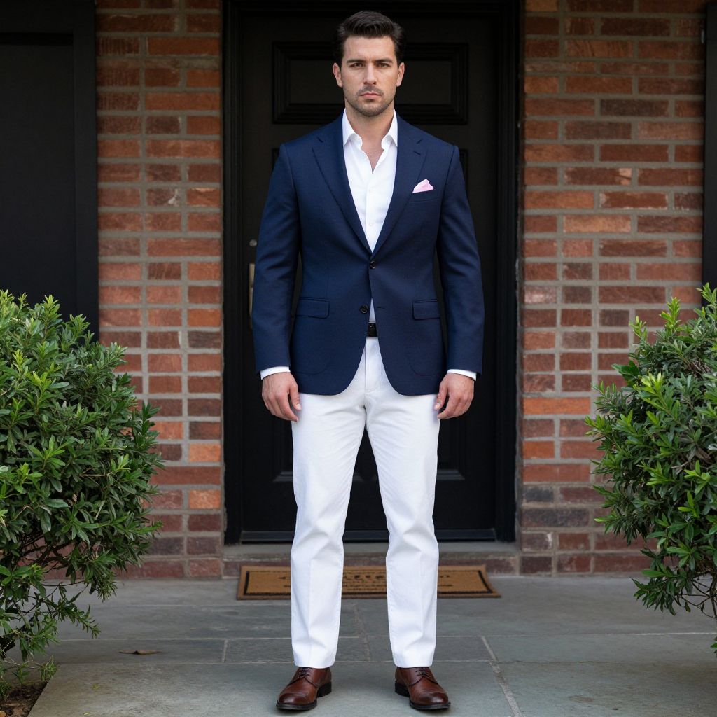 Photograph of a handsome, dark-haired man standing on a stone porch. He's wearing a sharp navy blue blazer over a white dress shirt, white pants, and brown leather shoes. A pink pocket square peeks from his jacket. He's in front of a brick building with black doors and two green bushes on either side. His expression is serious and confident.