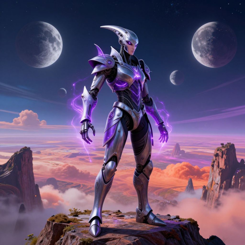 Vexon, elegant alien warrior with bio-mechanical armor, glowing purple energy emanating from hands, standing atop a cliff overlooking a surreal alien planet with multiple moons, vivid colors, fantasy sci-fi blend, cinematic composition