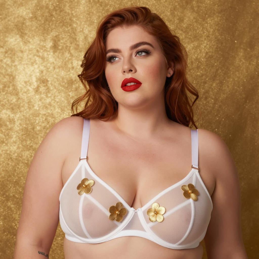 Photograph of a curvy woman with fair skin, brown hair, and long eyelashes. She wears a green bikini top with white daisy patterns, tied at the center. Her lips are pink and slightly parted. She has a gold necklace and small hoop earrings. She is standing in front of a white, paneled wall with dried grass on the right. She smiles subtly at the camera.