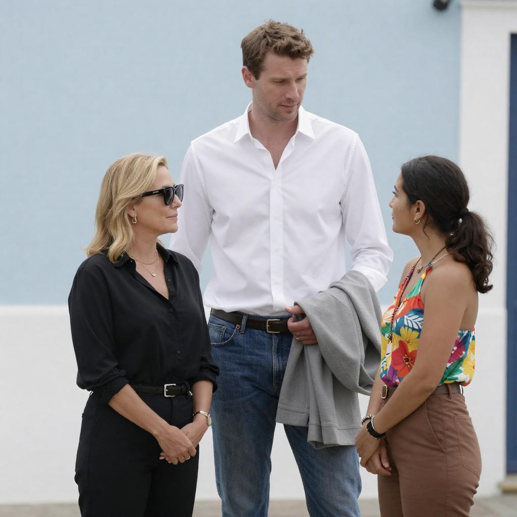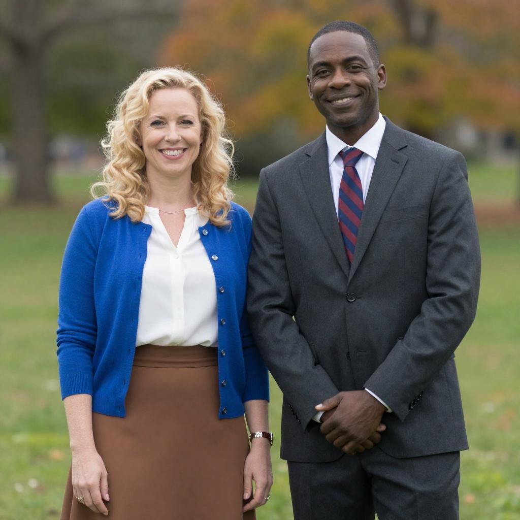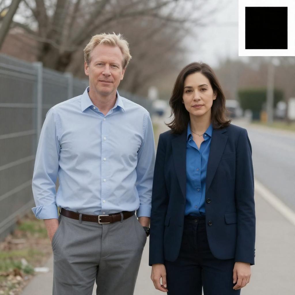 Photograph of three people standing on a wet, gravel driveway. A tall Black man in a gray suit and yellow tie stands on the left, a blonde woman in a black suit and white blouse is in the center, and a brunette woman in a blue hoodie and jeans is on the right. Background includes parked cars, greenery, and a building.