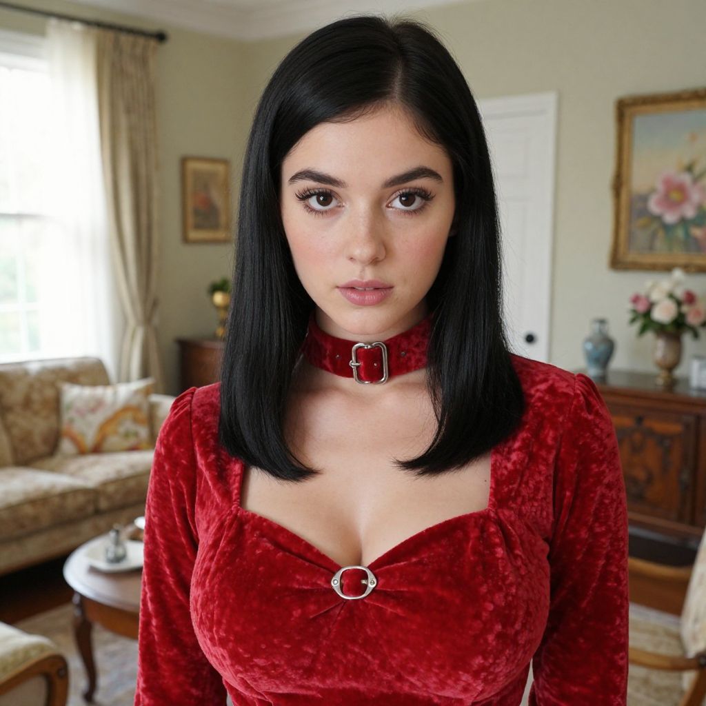 A close-up realistic portrait of a young woman with a perfectly straight, sleek black hairstyle, wearing a vintage 1950s red velvet dress with a high neckline and silver buckles, standing in a sunlit living room with floral decor and vintage furniture.. The woman has big tits and cute face