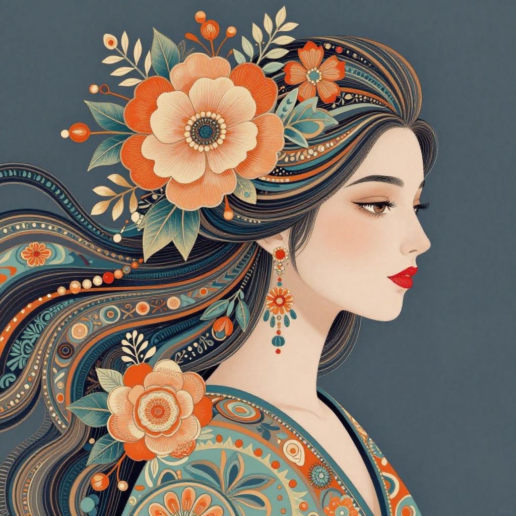 This stunning illustration features a beautifully detailed profile of a woman adorned with flowing hair and vibrant floral elements. The intricate patterns and harmonious color palette create an enchanting atmosphere, showcasing a blend of elegance and artistic flair.