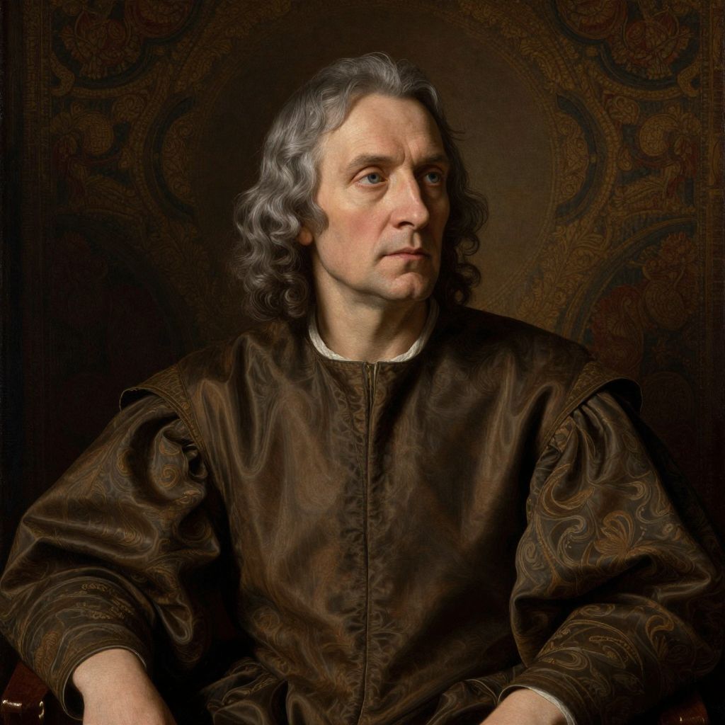 This is a digital portrait of an older white man with wavy, shoulder-length gray hair, wearing a dark brown, ornately patterned Renaissance-style tunic with puffed sleeves. His expression is serious and contemplative, with light skin and slightly pronounced cheekbones. The background is a dark, textured pattern with circular motifs, creating a rich, historical ambiance. The lighting highlights his face and upper body, casting subtle shadows that enhance the depth and detail of his expression and clothing. The overall style is highly realistic, emphasizing the textures and colors of the fabric and the subject's features.