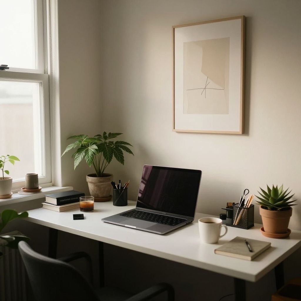 Lofi style bedroom workspace with laptop and coffee, cluttered desk, soft morning light through window, minimalist art on walls, plants nearby, cozy and creative environment