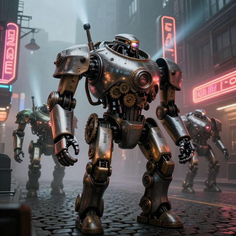 Dieselpunk mechs marching through a futuristic 1940s-inspired metropolis, with retro chrome detailing, exposed gears, and bulky mechanical arms, illuminated by flickering neon signs and searchlights cutting through thick fog on cobblestone streets.