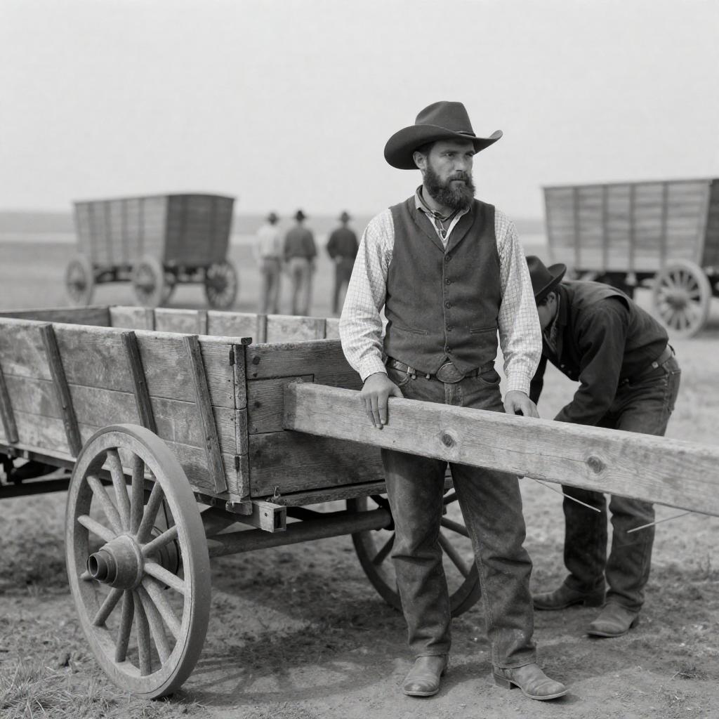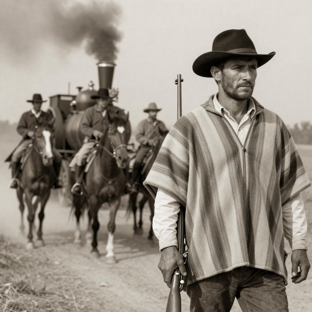 Black-and-white photograph of a Western gunfight. Foreground: armed man in hat, crouching, firing rifle at horseback riders. Midground: two horse-drawn wagons, dust rising. Background: more horseback riders. Ground: sacks, grass, scattered objects. Intense action. Multiple people. Dusty, mountainous terrain.